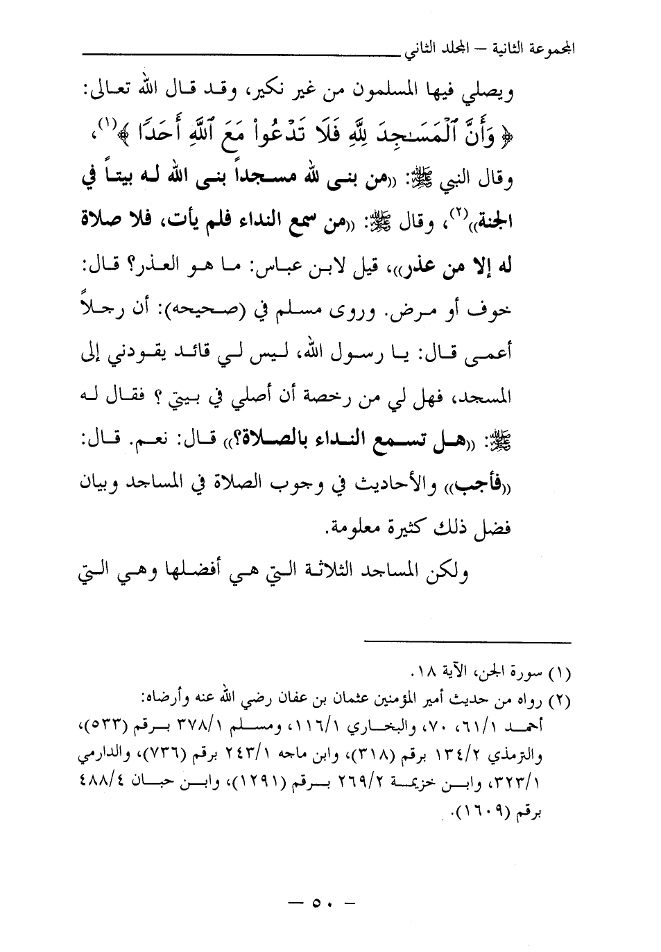 ويصلي فيها المسلمون من غير نكير، وقد قال الله تعالى: {وَأَنَّ الْمَسَاجِدَ لِلَّهِ فَلَا تَدْعُوا مَعَ اللَّهِ أَحَدًا} (¬1) ، وقال النبي صلى الله عليه وسلم: «من بنى لله مسجدا بنى الله له بيتا في الجنة (¬2) » ، وقال صلى الله عليه وسلم: «من سمع النداء فلم يأت، فلا صلاة له إلا من عذر "، قيل لابن عباس: ما هو العذر؟ قال: خوف أو مرض (¬3) » . وروى مسلم في (صحيحه) : «أن رجلا أعمى قال: يا رسول الله، ليس لي قائد يقودني إلى المسجد، فهل لي من رخصة أن أصلي في بيتي؟ فقال له صلى الله عليه وسلم: " هل تسمع النداء بالصلاة؟ " قال: نعم. قال: " فأجب (¬4) » والأحاديث في وجوب الصلاة في المساجد وبيان فضل ذلك كثيرة معلومة.