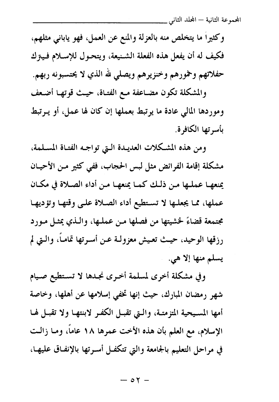 ومن هذه المشكلات العديدة التي تواجه الفتاة المسلمة، مشكلة إقامة الفرائض مثل لبس الحجاب، ففي كثير من الأحيان يمنعها عملها من ذلك كما يمنعها من أداء الصلاة في مكان عملها، مما يجعلها لا تستطيع أداء الصلاة على وقتها وتؤديها مجتمعة قضاء لخشيتها من فصلها من عملها، والذي يمثل مورد رزقها الوحيد، حيث تعيش معزولة عن أسرتها تماما، والتي لم يسلم منها إلا هي.