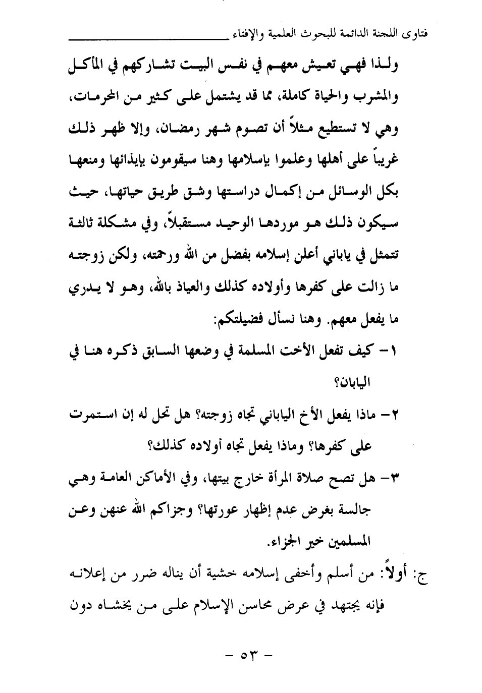 ولذا فهي تعيش معهم في نفس البيت تشاركهم في المأكل والمشرب والحياة كاملة، مما قد يشتمل على كثير من المحرمات، وهي لا تستطيع مثلا أن تصوم شهر رمضان، وإلا ظهر ذلك غريبا على أهلها وعلموا بإسلامها وهنا سيقومون بإيذائها ومنعها بكل الوسائل من إكمال دراستها وشق طريق حياتها، حيث سيكون ذلك هو موردها الوحيد مستقبلا، وفي مشكلة ثالثة تتمثل في ياباني أعلن إسلامه بفضل من الله ورحمته، ولكن زوجته ما زالت على كفرها وأولاده كذلك والعياذ بالله، وهو لا يدري ما يفعل معهم. وهنا نسأل فضيلتكم: