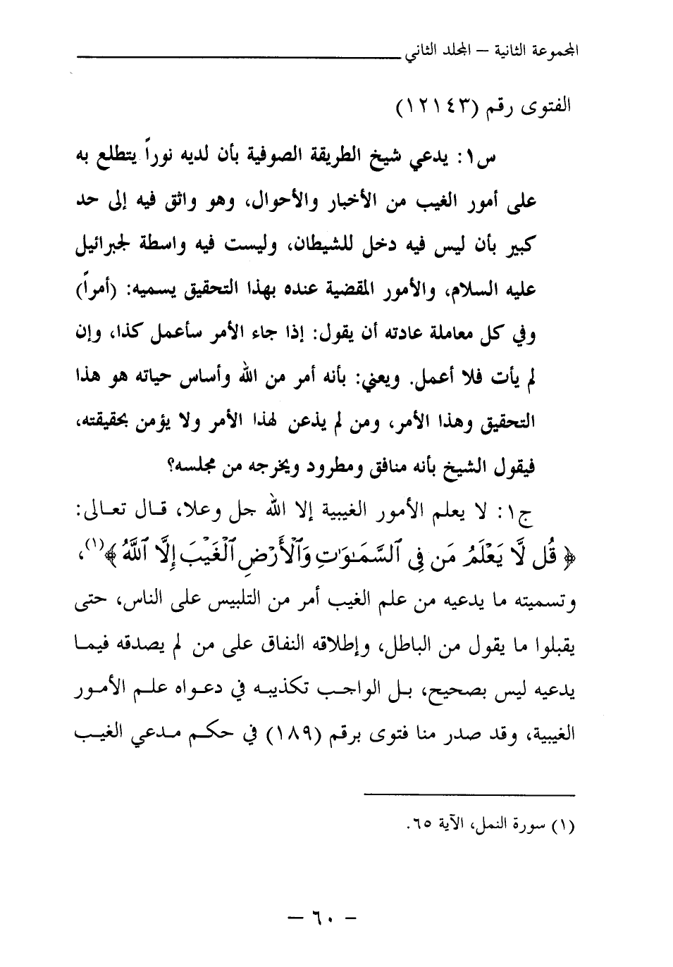س 1: يدعي شيخ الطريقة الصوفية بأن لديه نورا يتطلع به على أمور الغيب من الأخبار والأحوال، وهو واثق فيه إلى حد كبير بأن ليس فيه دخل للشيطان، وليست فيه واسطة لجبرائيل عليه السلام، والأمور المقضية عنده بهذا التحقيق يسميه: (أمرا) وفي كل معاملة عادته أن يقول: إذا جاء الأمر سأعمل كذا، وإن لم يأت فلا أعمل. ويعني: بأنه أمر من الله وأساس حياته هو هذا التحقيق وهذا الأمر، ومن لم يذعن لهذا الأمر ولا يؤمن بحقيقته، فيقول الشيخ بأنه منافق ومطرود ويخرجه من مجلسه؟