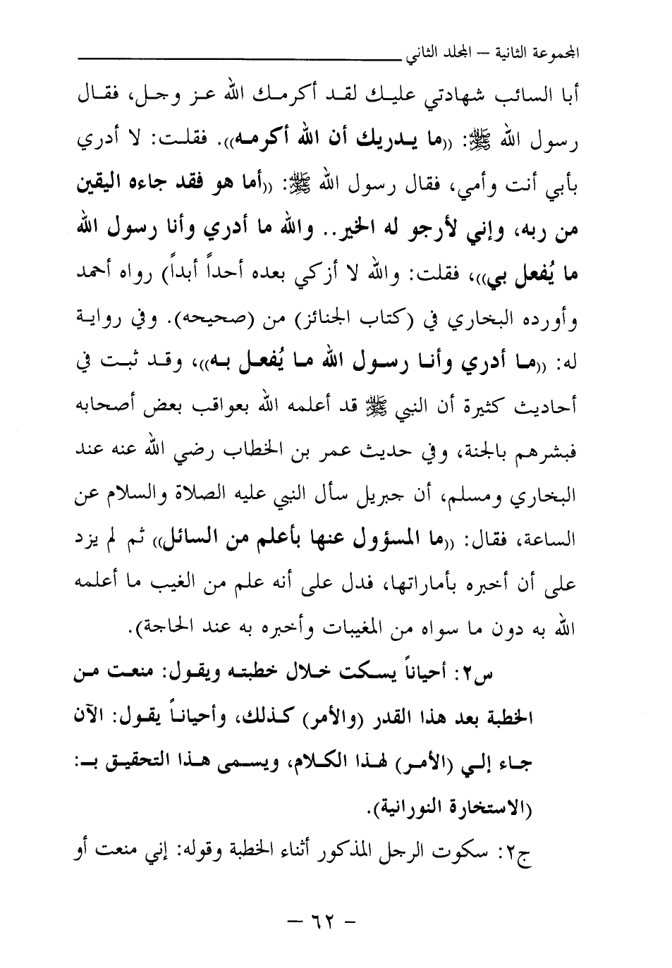 أبا السائب شهادتي عليك لقد أكرمك الله عز وجل، فقال رسول الله صلى الله عليه وسلم: " ما يدريك أن الله أكرمه ". فقلت: لا أدري بأبي أنت وأمي، فقال رسول الله صلى الله عليه وسلم: " أما هو فقد جاءه اليقين من ربه، وإني لأرجو له الخير. . والله ما أدري وأنا رسول الله ما يفعل بي "، فقلت: والله لا أزكي بعده أحدا أبدا (¬1) » رواه أحمد وأورده البخاري في (كتاب الجنائز) من (صحيحه) . وفي رواية له: «ما أدري وأنا رسول الله ما يفعل به (¬2) » ، وقد ثبت في أحاديث كثيرة أن النبي صلى الله عليه وسلم قد أعلمه الله بعواقب بعض أصحابه فبشرهم بالجنة، وفي حديث عمر بن الخطاب رضي الله عنه عند البخاري ومسلم، «أن جبريل سأل النبي عليه الصلاة والسلام عن الساعة، فقال: " ما المسؤول عنها بأعلم من السائل (¬3) » ثم لم يزد على أن أخبره بأماراتها، فدل على أنه علم من الغيب ما أعلمه الله به دون ما سواه من المغيبات وأخبره به عند الحاجة) .