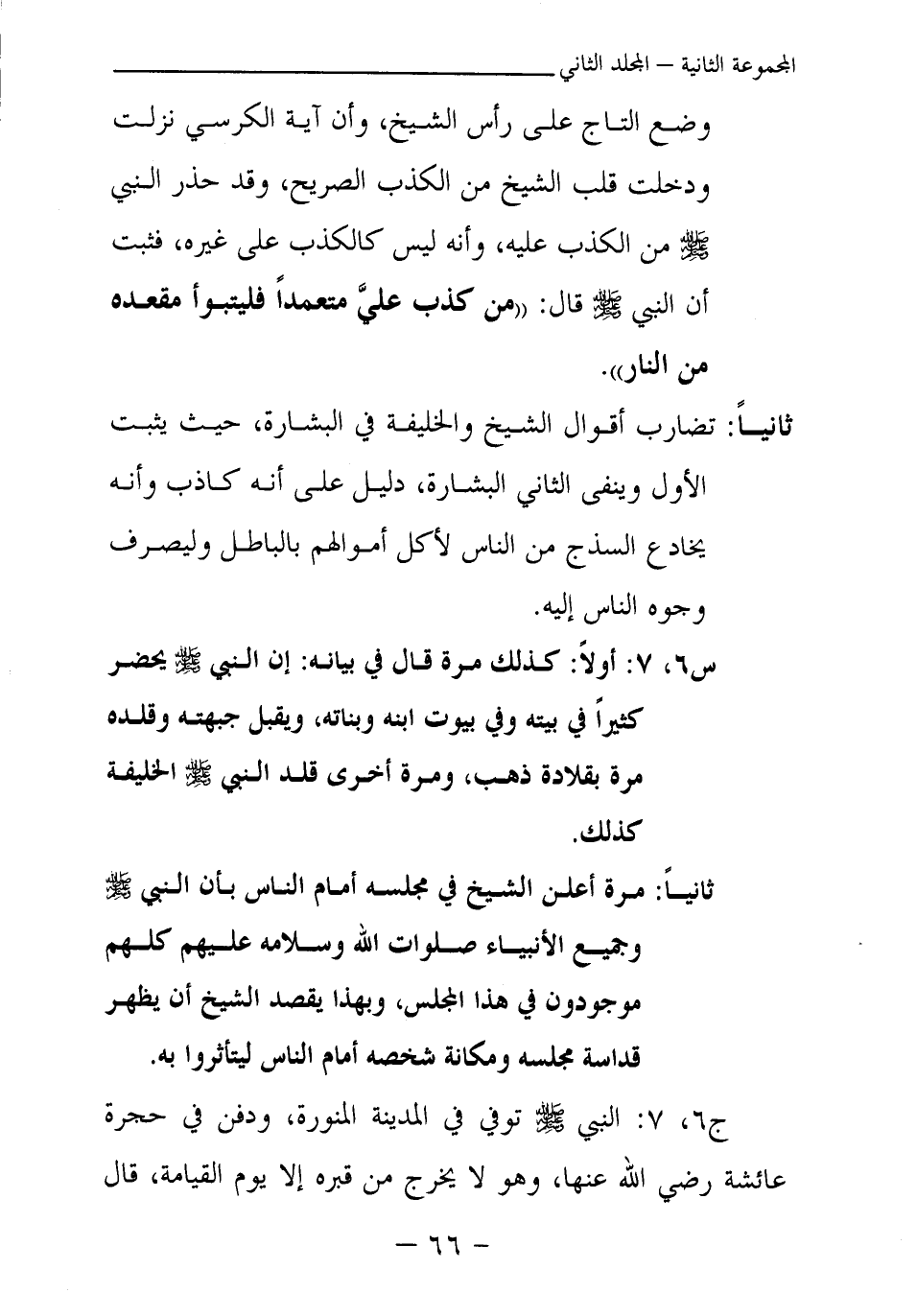 وضع التاج على رأس الشيخ، وأن آية الكرسي نزلت ودخلت قلب الشيخ من الكذب الصريح، وقد حذر النبي صلى الله عليه وسلم من الكذب عليه، وأنه ليس كالكذب على غيره، فثبت أن النبي صلى الله عليه وسلم قال: «من كذب علي متعمدا فليتبوأ مقعده من النار (¬1) » .