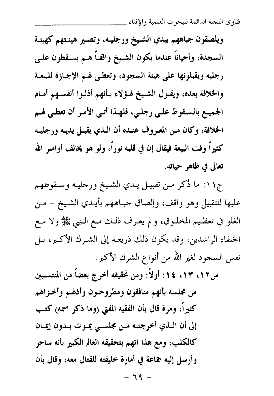 ج 11: ما ذكر من تقبيل يدي الشيخ ورجليه وسقوطهم عليها للتقبيل وهو واقف، وإلصاق جباههم بأيدي الشيخ - من الغلو في تعظيم المخلوق، ولم يعرف ذلك مع النبي صلى الله عليه وسلم ولا مع الخلفاء الراشدين، وقد يكون ذلك ذريعة إلى الشرك الأكبر، بل نفس السجود لغير الله من أنواع الشرك الأكبر.
