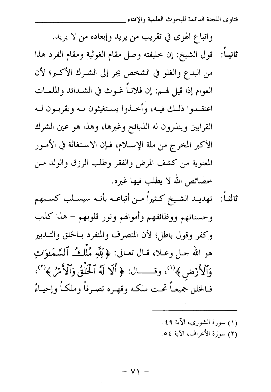 ثانيا: قول الشيخ: إن خليفته وصل مقام الغوثية ومقام الفرد هذا من البدع والغلو في الشخص يجر إلى الشرك الأكبر؛ لأن العوام إذا قيل لهم: إن فلانا غوث في الشدائد والملمات اعتقدوا ذلك فيه، وأخذوا يستغيثون به ويقربون له القرابين وينذرون له الذبائح وغيرها، وهذا هو عين الشرك الأكبر المخرج من ملة الإسلام، فإن الاستغاثة في الأمور المعنوية من كشف المرض والفقر وطلب الرزق والولد من خصائص الله لا يطلب فيها غيره.