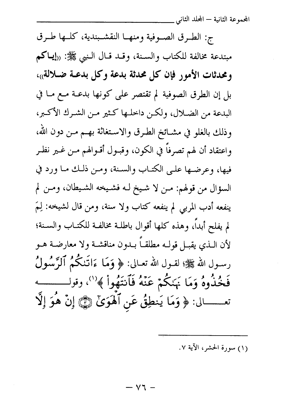 ج: الطرق الصوفية ومنها النقشبندية، كلها طرق مبتدعة مخالفة للكتاب والسنة، وقد قال النبي صلى الله عليه وسلم: «إياكم ومحدثات الأمور فإن كل محدثة بدعة وكل بدعة ضلالة (¬1) » ، بل إن الطرق الصوفية لم تقتصر على كونها بدعة مع ما في البدعة من الضلال، ولكن داخلها كثير من الشرك الأكبر، وذلك بالغلو في مشائخ الطرق والاستغاثة بهم من دون الله، واعتقاد أن لهم تصرفا في الكون، وقبول أقوالهم من غير نظر فيها، وعرضها على الكتاب والسنة، ومن ذلك ما ورد في السؤال من قولهم: من لا شيخ له فشيخه الشيطان، ومن لم ينفعه أدب المربي لم ينفعه كتاب ولا سنة، ومن قال لشيخه: لم لم يفلح أبدا، وهذه كلها أقوال باطلة مخالفة للكتاب والسنة؛ لأن الذي يقبل قوله مطلقا بدون مناقشة ولا معارضة هو رسول الله صلى الله عليه وسلم؛ لقول الله تعالى: {وَمَا آتَاكُمُ الرَّسُولُ فَخُذُوهُ وَمَا نَهَاكُمْ عَنْهُ فَانْتَهُوا} (¬2) ، وقوله تعالى: {وَمَا يَنْطِقُ عَنِ الْهَوَى} (¬3) {إِنْ هُوَ إِلَّا وَحْيٌ يُوحَى} (¬4)