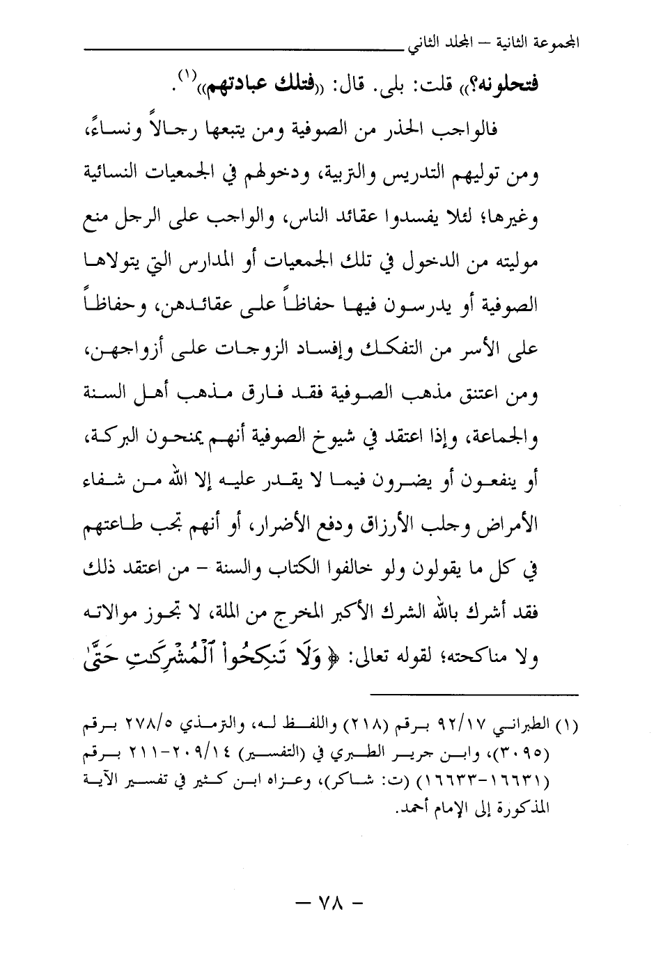 فالواجب الحذر من الصوفية ومن يتبعها رجالا ونساء، ومن توليهم التدريس والتربية، ودخولهم في الجمعيات النسائية وغيرها، لئلا يفسدوا عقائد الناس، والواجب على الرجل منع موليته من الدخول في تلك الجمعيات أو المدارس التي يتولاها الصوفية أو يدرسون فيها حفاظا على عقائدهن، وحفاظا على الأسر من التفكك وإفساد الزوجات على أزواجهن، ومن اعتنق مذهب الصوفية فقد فارق مذهب أهل السنة والجماعة، وإذا اعتقد في شيوخ الصوفية أنهم يمنحون البركة، أو ينفعون أو يضرون فيما لا يقدر عليه إلا الله من شفاء الأمراض وجلب الأرزاق ودفع الأضرار، أو أنهم تجب طاعتهم في كل ما يقولون ولو خالفوا الكتاب والسنة - من اعتقد ذلك فقد أشرك بالله الشرك الأكبر المخرج من الملة، لا تجوز موالاته ولا مناكحته؛ لقوله تعالى: {وَلَا تَنْكِحُوا الْمُشْرِكَاتِ حَتَّى يُؤْمِنَّ} (¬2)