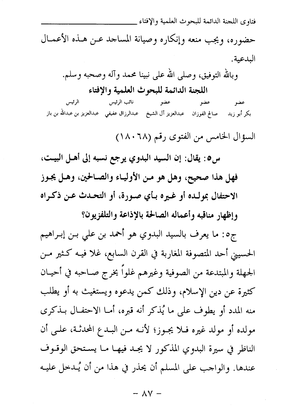 ج 5: ما يعرف بالسيد البدوي هو أحمد بن علي بن إبراهيم الحسيني أحد المتصوفة المغاربة في القرن السابع، غلا فيه كثير من الجهلة والمبتدعة من الصوفية وغيرهم غلوا يخرج صاحبه في أحيان كثيرة عن دين الإسلام، وذلك كمن يدعوه ويستغيث به أو يطلب منه المدد أو يطوف على ما يذكر أنه قبره، أما الاحتفال بذكرى مولده أو مولد غيره فلا يجوز، لأنه من البدع المحدثة، على أن الناظر في سيرة البدوي المذكور لا يجد فيها ما يستحق الوقوف عندها. والواجب على المسلم أن يحذر في هذا من أن يدخل عليه