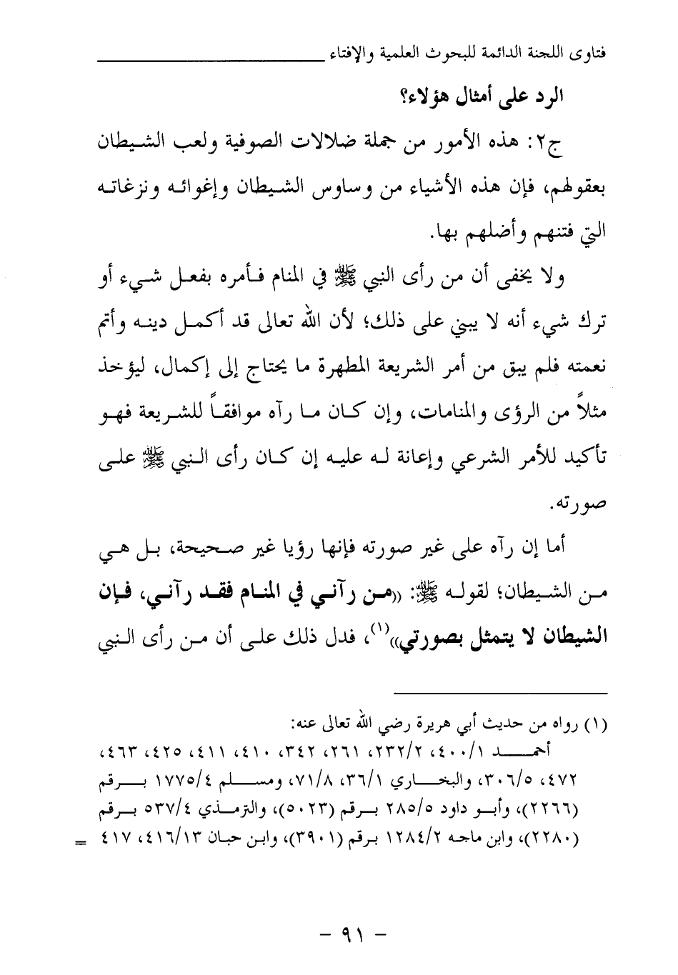 ولا يخفى أن من رأى النبي صلى الله عليه وسلم في المنام فأمره بفعل شيء أو ترك شيء أنه لا يبني على ذلك، لأن الله تعالى قد أكمل دينه وأتم نعمته فلم يبق من أمر الشريعة المطهرة ما يحتاج إلى إكمال، ليؤخذ مثلا من الرؤى والمنامات، وإن كان ما رآه موافقا للشريعة فهو تأكيد للأمر الشرعي وإعانة له عليه إن كان رأى النبي صلى الله عليه وسلم على صورته.