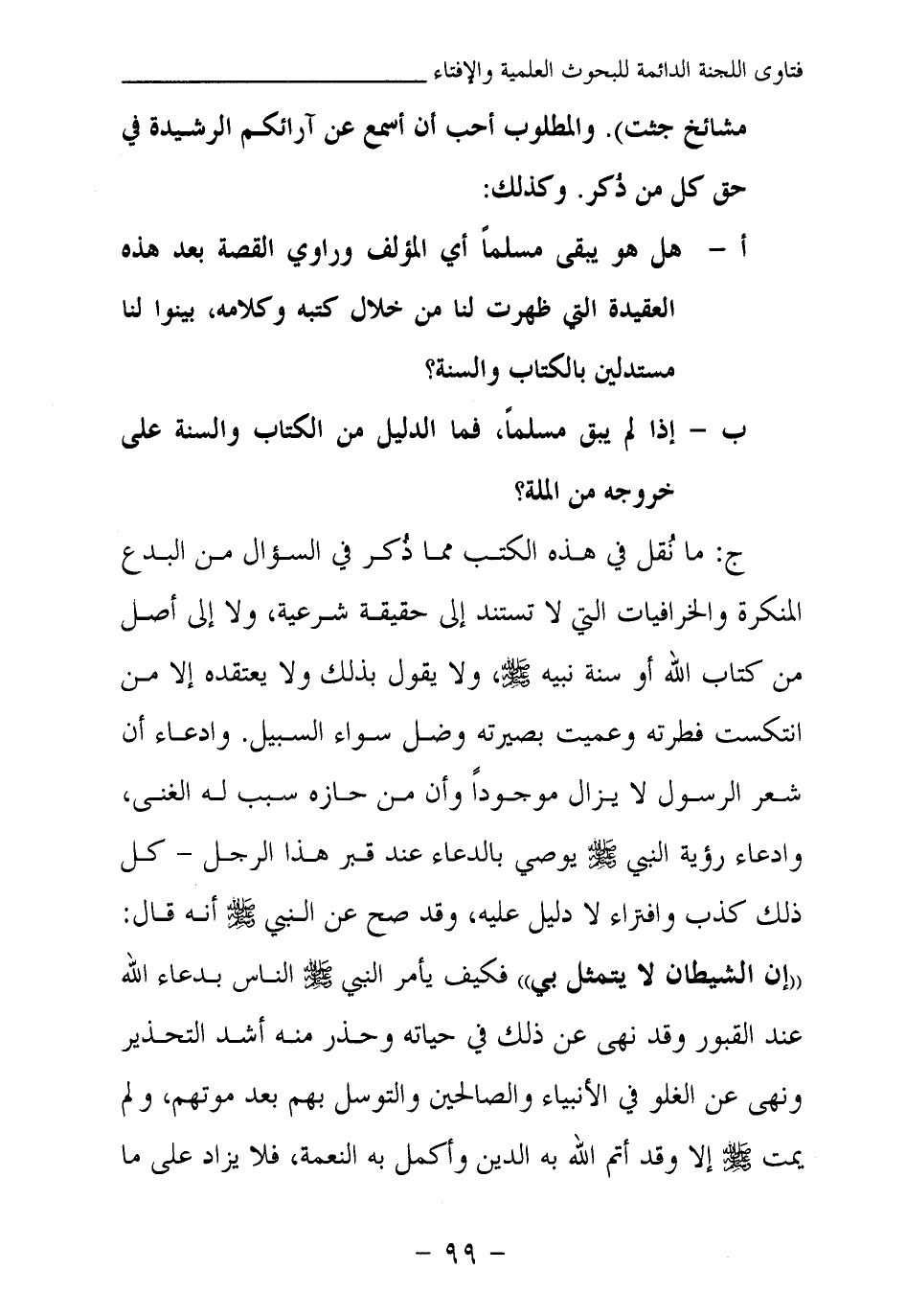 ج: ما نقل في هذه الكتب مما ذكر في السؤال من البدع المنكرة والخرافيات التي لا تستند إلى حقيقة شرعية، ولا إلى أصل من كتاب الله أو سنة نبيه صلى الله عليه وسلم، ولا يقول بذلك ولا يعتقده إلا من انتكست فطرته وعميت بصيرته وضل سواء السبيل. وادعاء أن شعر الرسول لا يزال موجودا وأن من حازه سبب له الغنى، وادعاء رؤية النبي صلى الله عليه وسلم يوصي بالدعاء عند قبر هذا الرجل - كل ذلك كذب وافتراء لا دليل عليه، وقد صح عن النبي صلى الله عليه وسلم أنه قال: «إن الشيطان لا يتمثل بي (¬1) » فكيف يأمر النبي صلى الله عليه وسلم الناس بدعاء الله عند القبور وقد نهى عن ذلك في حياته وحذر منه أشد التحذير ونهى عن الغلو في الأنبياء والصالحين والتوسل بهم بعد موتهم، ولم يمت صلى الله عليه وسلم إلا وقد أتم الله به الدين وأكمل به النعمة، فلا يزاد على ما
