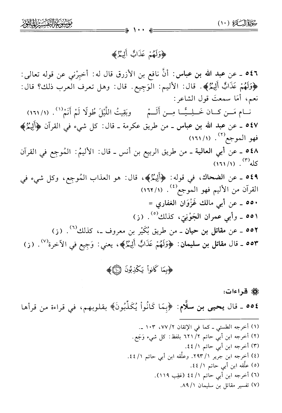 ٥٤٦ - عن عبد الله بن عباس: أنّ نافع بن الأزرق قال له: أخبِرْني عن قوله تعالى: {ولهم عذاب أليم}. قال: الأليم: الوَجِيع. قال: وهل تعرف العرب ذلك؟ قال: نعم، أما سمعتَ قول الشاعر: