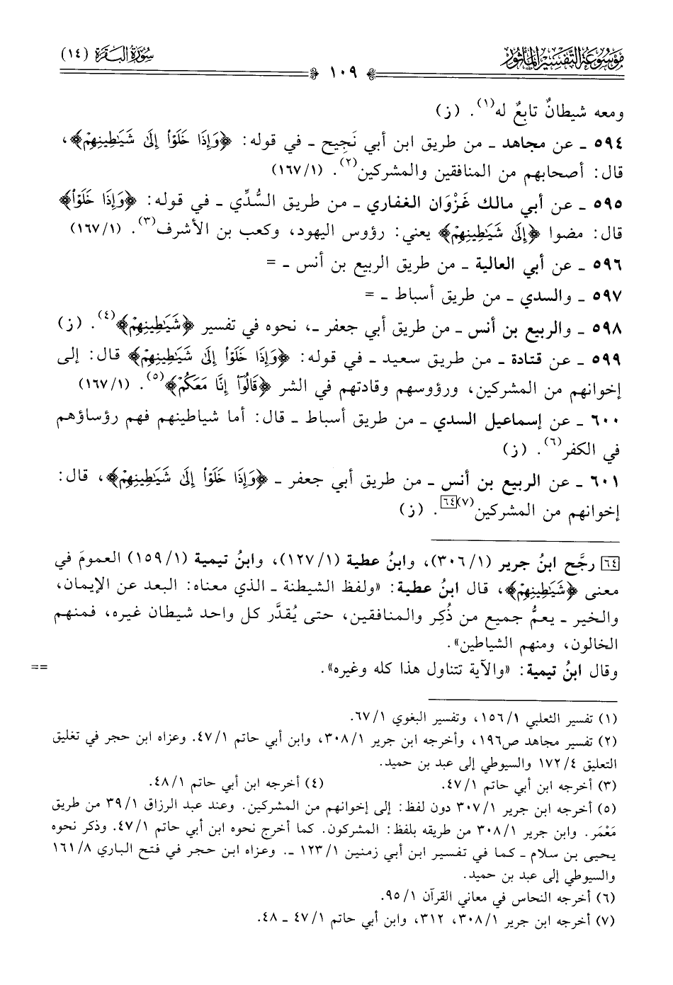 ٥٩٤ - عن مجاهد -من طريق ابن أبي نَجِيح- في قوله: {وإذا خَلَوْا إلى شَياطِينِهِمْ}، قال: أصحابهم من المنافقين والمشركين (¬٢). (١/ ١٦٧)