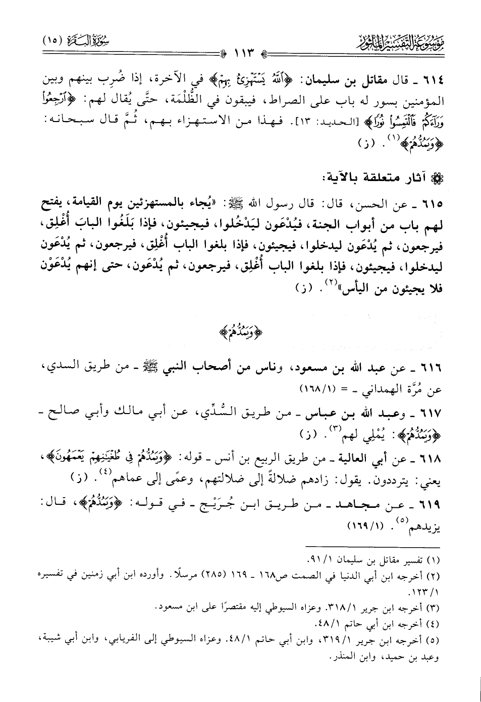 ٦١٤ - قال مقاتل بن سليمان: {اللَّهُ يَسْتَهْزِئُ بِهِمْ} في الآخرة، إذا ضُرِب بينهم وبين المؤمنين بسور له باب على الصراط، فيبقون في الظُّلْمَة، حتّى يُقال لهم: {ارْجِعُوا وراءَكُمْ فالتَمِسُوا نُورًا} [الحديد: ١٣]. فهذا من الاستهزاء بهم، ثُمَّ قال سبحانه: {ويَمُدُّهُمْ} (¬١). (ز)