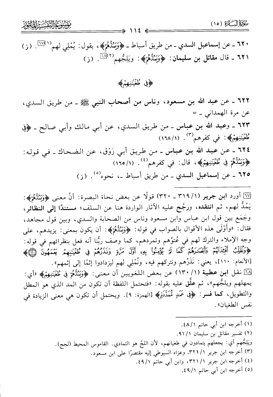 ٦٢٣ - وعبد الله بن عباس -من طريق السدي، عن أبي مالك وأبي صالح- {في طغيانهم}: في كفرهم (¬٣). (١/ ١٦٨)