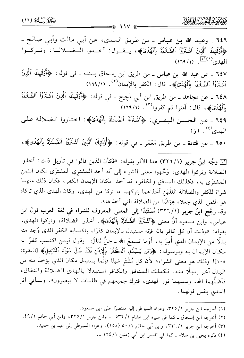 [٦٩] وجَّه ابنُ جرير (١/ ٣٢٦) هذا الأثر بقوله: «فكأن الذين قالوا في تأويل ذلك: أخذوا الضلالة وتركوا الهدى، وجَّهوا معنى الشراء إلى أنه أخذ المشترِي المشترى مكان الثمن المشترى به، فكذلك المنافق والكافر، قد أخذا مكان الإيمان الكفر، فكان ذلك منهما شراءً للكفر والضلالة اللذَيْن أخَذاهما بتركهما ما تركا من الهدى، وكان الهدى الذي تركاه هو الثمن الذي جعلاه عِوَضًا من الضلالة التي أخذاها».