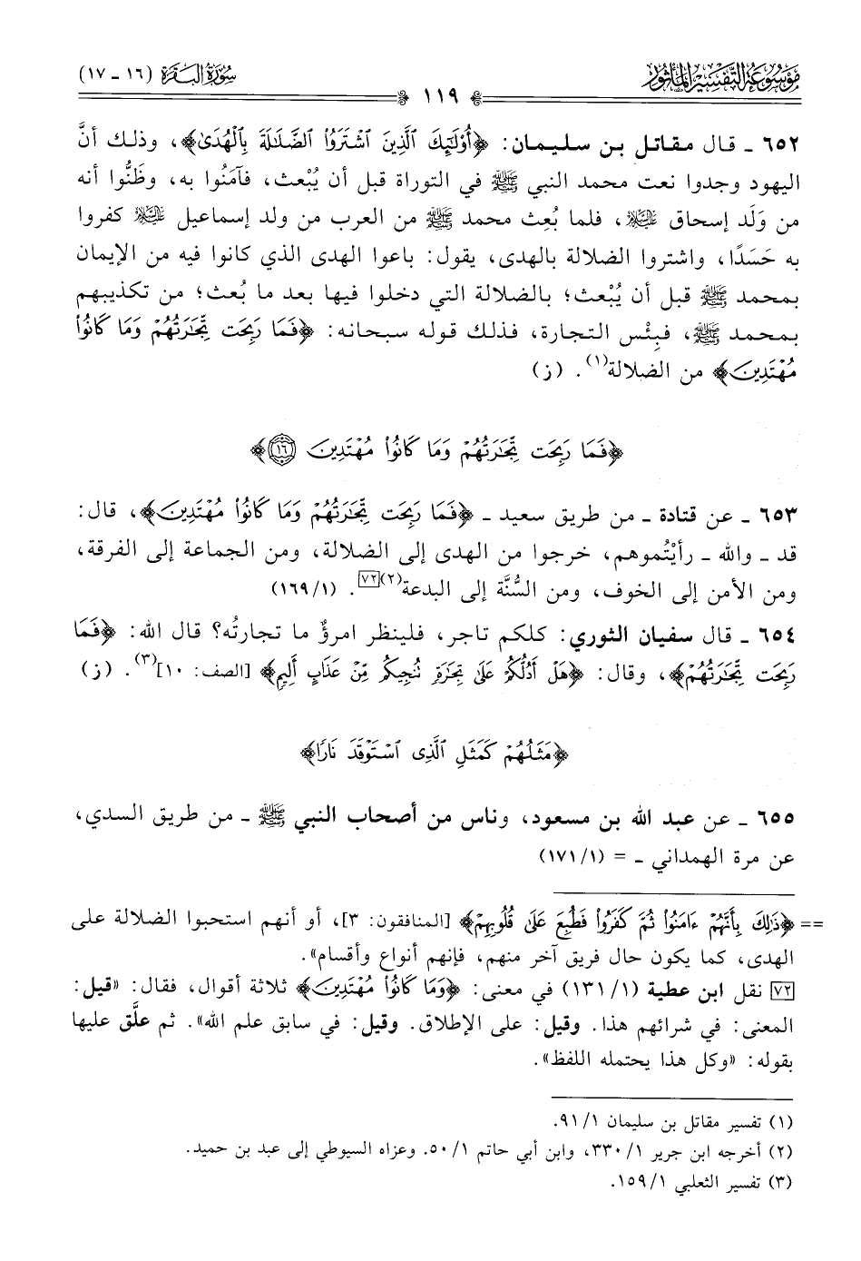 ٦٥٣ - عن قتادة -من طريق سعيد- {فَما رَبِحَتْ تِجارَتُهُمْ وما كانُوا مُهْتَدِينَ}، قال: قد -والله- رأيْتُموهم، خرجوا من الهدى إلى الضلالة، ومن الجماعة إلى الفرقة، ومن الأمن إلى الخوف، ومن السُّنَّة إلى البدعة (¬٢) [٧٢]. (١/ ١٦٩)