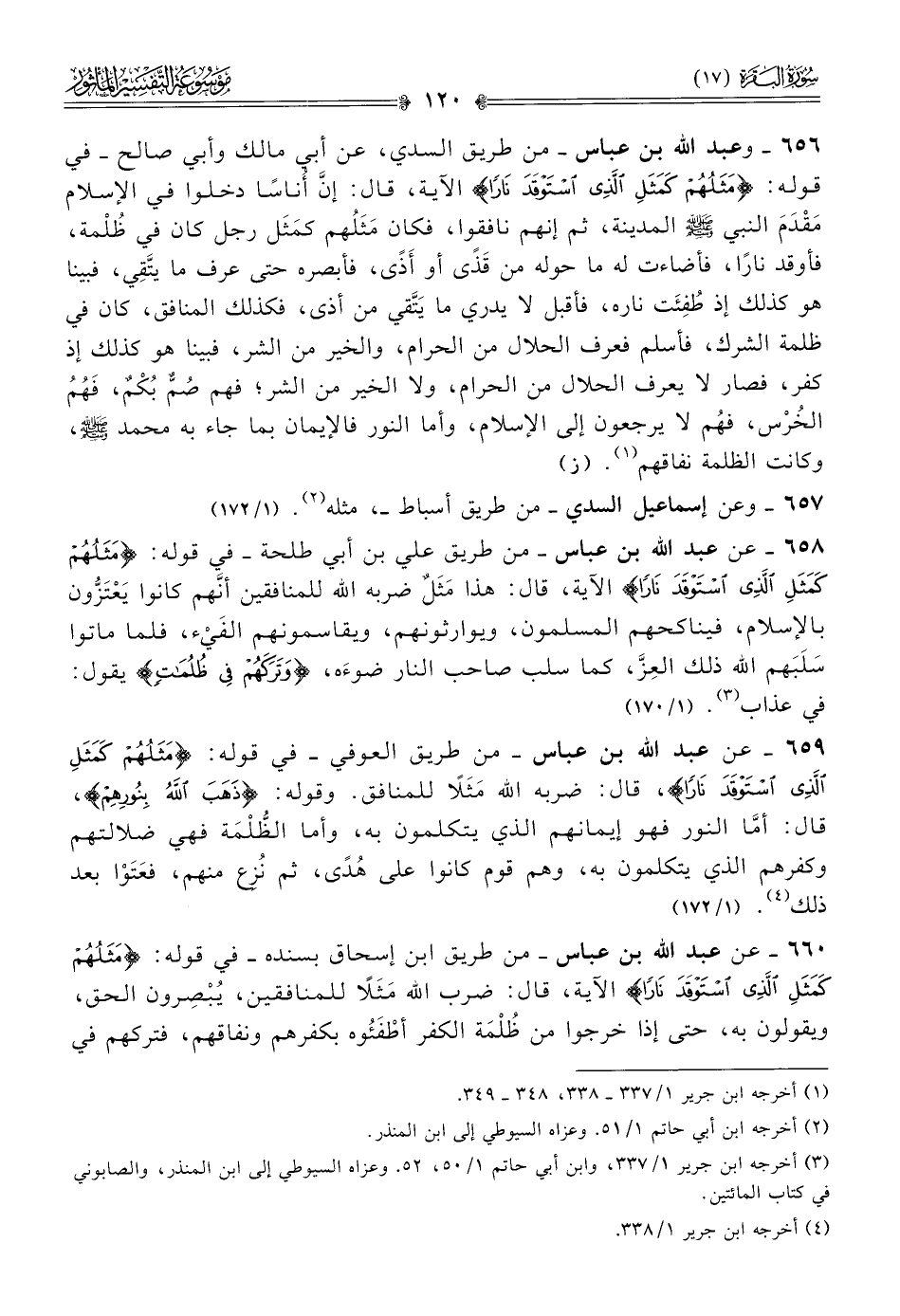 ٦٥٩ - عن عبد الله بن عباس -من طريق العوفي- في قوله: {مَثَلُهُمْ كَمَثَلِ الَّذِي اسْتَوْقَدَ نارًا}، قال: ضربه الله مَثَلًا للمنافق. وقوله: {ذهب الله بنورهم}، قال: أمّا النور فهو إيمانهم الذي يتكلمون به، وأما الظُّلْمَة فهي ضلالتهم وكفرهم الذي يتكلمون به، وهم قوم كانوا على هُدًى، ثم نُزِع منهم، فعَتَوْا بعد ذلك (¬٤). (١/ ١٧٢)