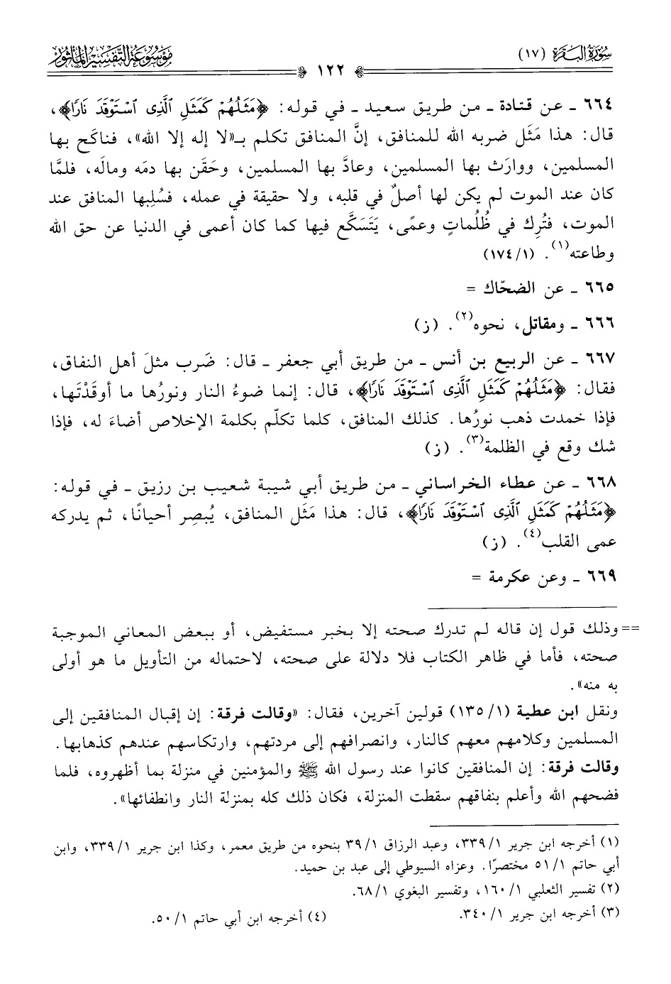 ٦٦٤ - عن قتادة -من طريق سعيد- في قوله: {مَثَلُهُمْ كَمَثَلِ الَّذِي اسْتَوْقَدَ نارًا}، قال: هذا مَثَل ضربه الله للمنافق، إنّ المنافق تكلم بـ «لا إله إلا الله»، فناكَح بها المسلمين، ووارَث بها المسلمين، وعادَّ بها المسلمين، وحَقَن بها دمَه ومالَه، فلمّا كان عند الموت لم يكن لها أصلٌ في قلبه، ولا حقيقة في عمله، فسُلِبها المنافق عند الموت، فتُرِك في ظُلُماتٍ وعمًى، يَتَسَكَّع فيها كما كان أعمى في الدنيا عن حق الله وطاعته (¬١). (١/ ١٧٤)