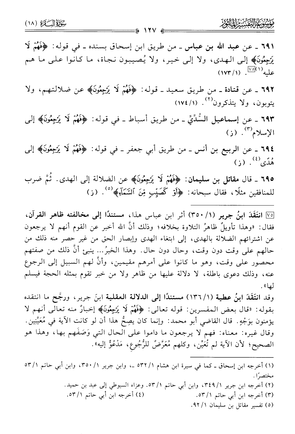 [٧٥] انتَقَدَ ابنُ جرير (١/ ٣٥٠) أثر ابن عباس هذا، مستندًا إلى مخالفته ظاهر القرآن، فقال: «وهذا تأويل ظاهر التلاوة بخلافه؛ وذلك أنّ الله أخبر عن القوم أنهم لا يرجعون عن اشترائهم الضلالة بالهدى، إلى ابتغاء الهدى وإبصار الحق من غير حصر منه ذلك من حالهم على وقت دون وقت، وحال دون حال. وهذا الخبرُ ... ينبئ أنّ ذلك من صفتهم محصور على وقت، وهو ما كانوا على أمرهم مقيمين، وأنّ لهم السبيل إلى الرجوع عنه، وذلك دعوى باطلة، لا دلالة عليها من ظاهر ولا من خبر تقوم بمثله الحجة فيسلم لها».