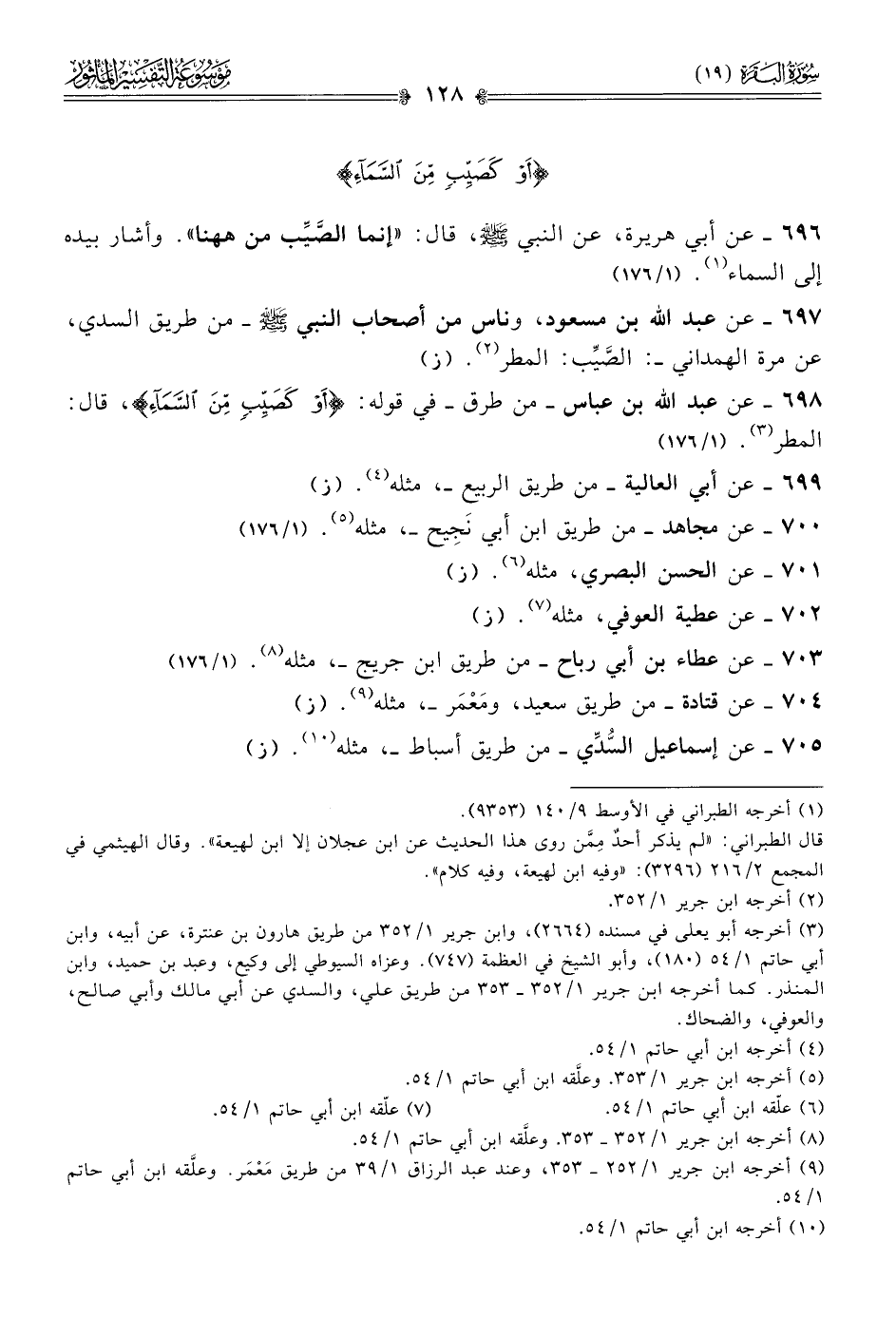 ٦٩٨ - عن عبد الله بن عباس -من طرق- في قوله: {أوْ كَصَيِّبٍ مِنَ السَّماءِ}، قال: المطر (¬٣). (١/ ١٧٦)
