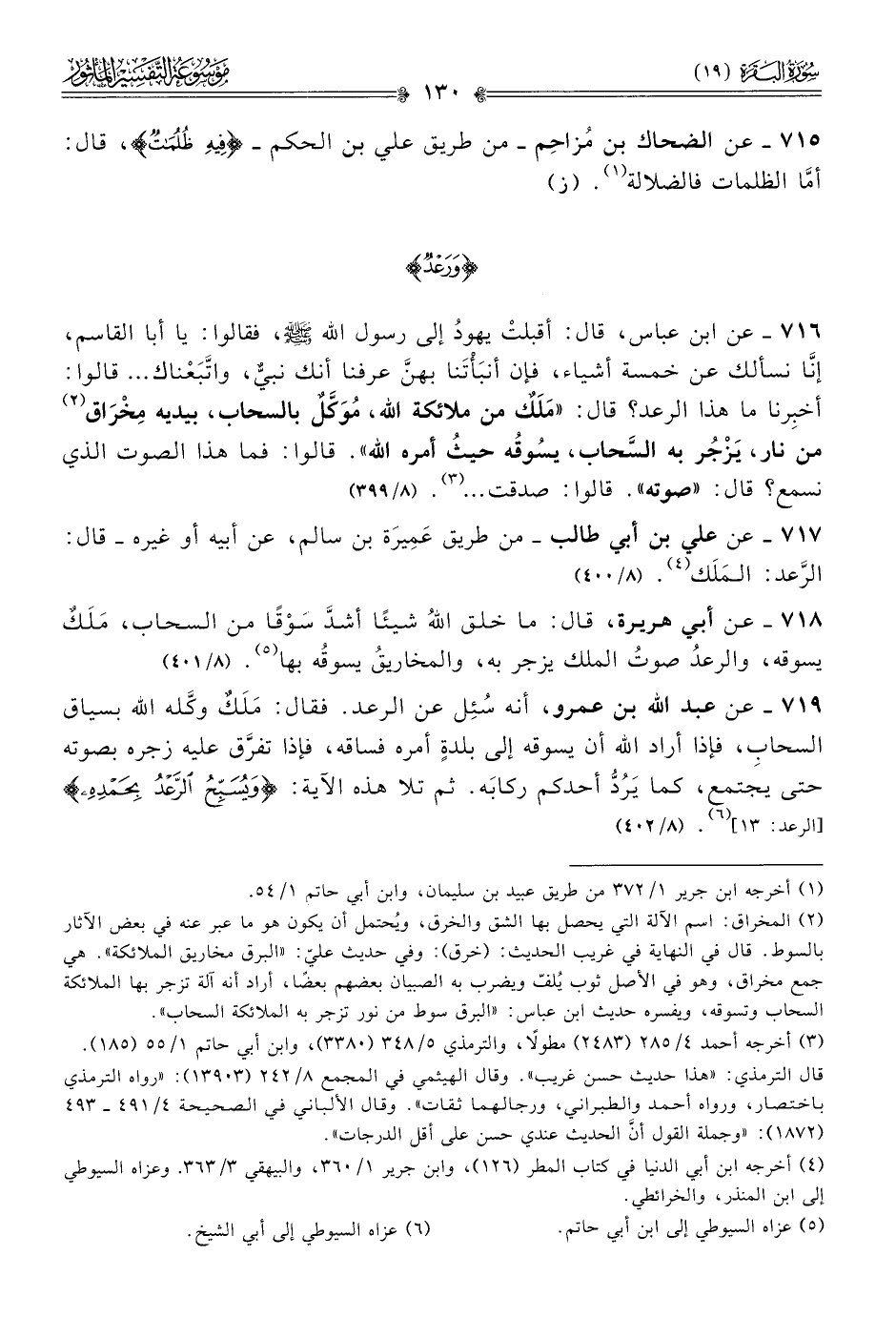 ٧١٩ - عن عبد الله بن عمرو، أنه سُئِل عن الرعد. فقال: مَلَكٌ وكَّله الله بسياق السحابِ، فإذا أراد الله أن يسوقه إلى بلدةٍ أمره فساقه، فإذا تفرَّق عليه زجره بصوته حتى يجتمع، كما يَرُدُّ أحدكم ركابَه. ثم تلا هذه الآية: {ويُسبحُ الرعدُ بحمدِهِ} [الرعد: ١٣] (¬٦). (٨/ ٤٠٢)