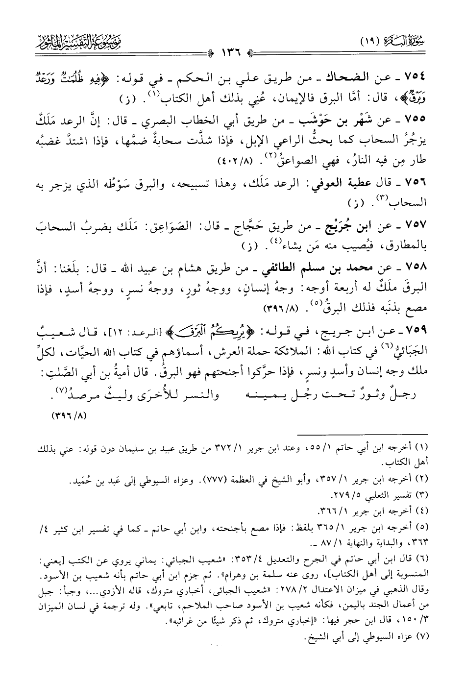 ٧٥٩ - عن ابن جريج، في قوله: {يريكُمُ البرقَ} [الرعد: ١٢]، قال شعيبٌ الجَبائيُّ (¬٦) في كتاب الله: الملائكة حملة العرش، أسماؤهم في كتاب الله الحيّات، لكلِّ ملك وجه إنسان وأسدٍ ونسرٍ، فإذا حرَّكوا أجنحتهم فهو البرقُ. قال أميةُ بن أبي الصَّلتِ:
