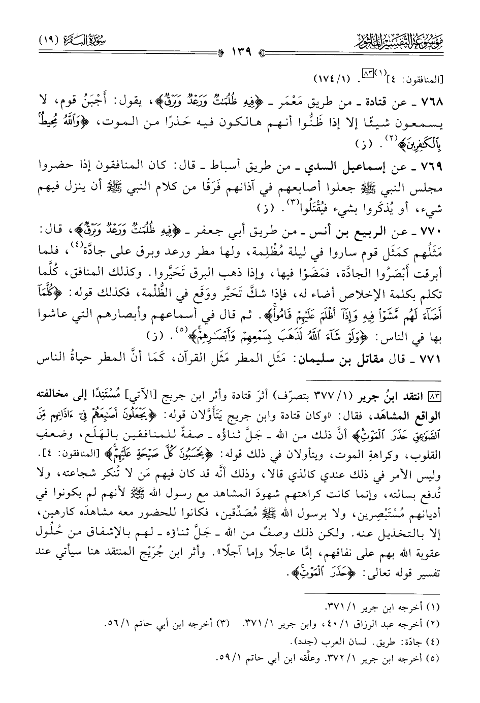 [٨٣] انتقد ابنُ جرير (١/ ٣٧٧ بتصرّف) أثرَ قتادة وأثر ابن جريج [الآتي] مُسْتَنِدًا إلى مخالفته الواقع المشاهَد، فقال: «وكان قتادة وابن جريج يَتَأَوَّلان قوله: {يجعلون أصابعهم في آذانهم من الصواعق حذر الموت} أنّ ذلك من الله -جَلَّ ثناؤُه- صفةٌ للمنافقين بالهَلَع، وضعفِ القلوب، وكراهةِ الموت، ويتأولان في ذلك قوله: {يحسبون كل صيحة عليهم} [المنافقون: ٤]. وليس الأمر في ذلك عندي كالذي قالا، وذلك أنّه قد كان فيهم مَن لا تُنكر شجاعته، ولا تُدفع بسالته، وإنما كانت كراهتهم شهودَ المشاهد مع رسول الله - صلى الله عليه وسلم - لأنهم لم يكونوا في أديانهم مُسْتَبْصِرين، ولا برسول الله - صلى الله عليه وسلم - مُصَدِّقين، فكانوا للحضور معه مشاهدَه كارهين، إلا بالتخذيل عنه. ولكن ذلك وصفٌ من الله -جَلَّ ثناؤه- لهم بالإشفاق من حُلُول عقوبة الله بهم على نفاقهم، إمّا عاجلًا وإما آجلًا». وأثر ابن جُرَيْج المنتقد هنا سيأتي عند تفسير قوله تعالى: {حَذَرَ المَوْتِ}.