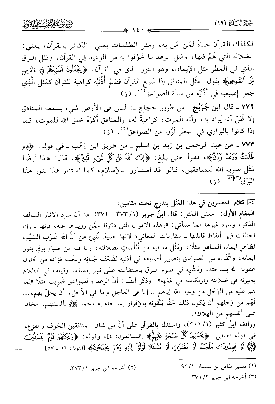 [٨٤] كلام المفسرين في هذا المَثَل يندرج تحت مقامين: المقام الأول: معنى المَثل: قال ابنُ جرير (١/ ٣٧٣ - ٣٧٤) بعد أن سرد الآثار السالفة الذكر، وسرد غيرها مما سيأتي: «وهذه الأقوال التي ذكرنا عمَّن رويناها عنه، فإنها -وإن اختلفت فيها ألفاظ قائليها- متقاربات المعاني؛ لأنها جميعًا تُنبِئ عن أنّ الله ضَرَب الصَّيِّب لظاهرِ إيمان المنافق مثلًا، ومَثَّل ما فيه من ظُلُماتٍ بضلالته، وما فيه من ضياءِ برقٍ بنور إيمانه، واتِّقاءه من الصواعق بتصيير أصابعه في أذنيه لِضَعْف جَنانِه ونخْب فؤاده من حُلول عقوبة الله بساحته، ومَشْيِه في ضوء البرق باستقامته على نور إيمانه، وقيامه في الظلام بحيرته في ضلالته وارتكاسه في عَمَهِه». وذَكَر أيضًا: أنّ الرعدَ والصواعق ضُرِبَت مثلًا "لِما هم عليه من الوَجَل من وعيد الله إياهم ... إما في العاجل وإما في الآجل، أن يحلّ بهم، ... فَهُم من وجلهم أن يَكون ذلك حَقًّا يَتَّقُونه بالإقرار بما جاء به محمد - صلى الله عليه وسلم - بألسنتهم، مخافةً على أنفسهم من الهلاك».