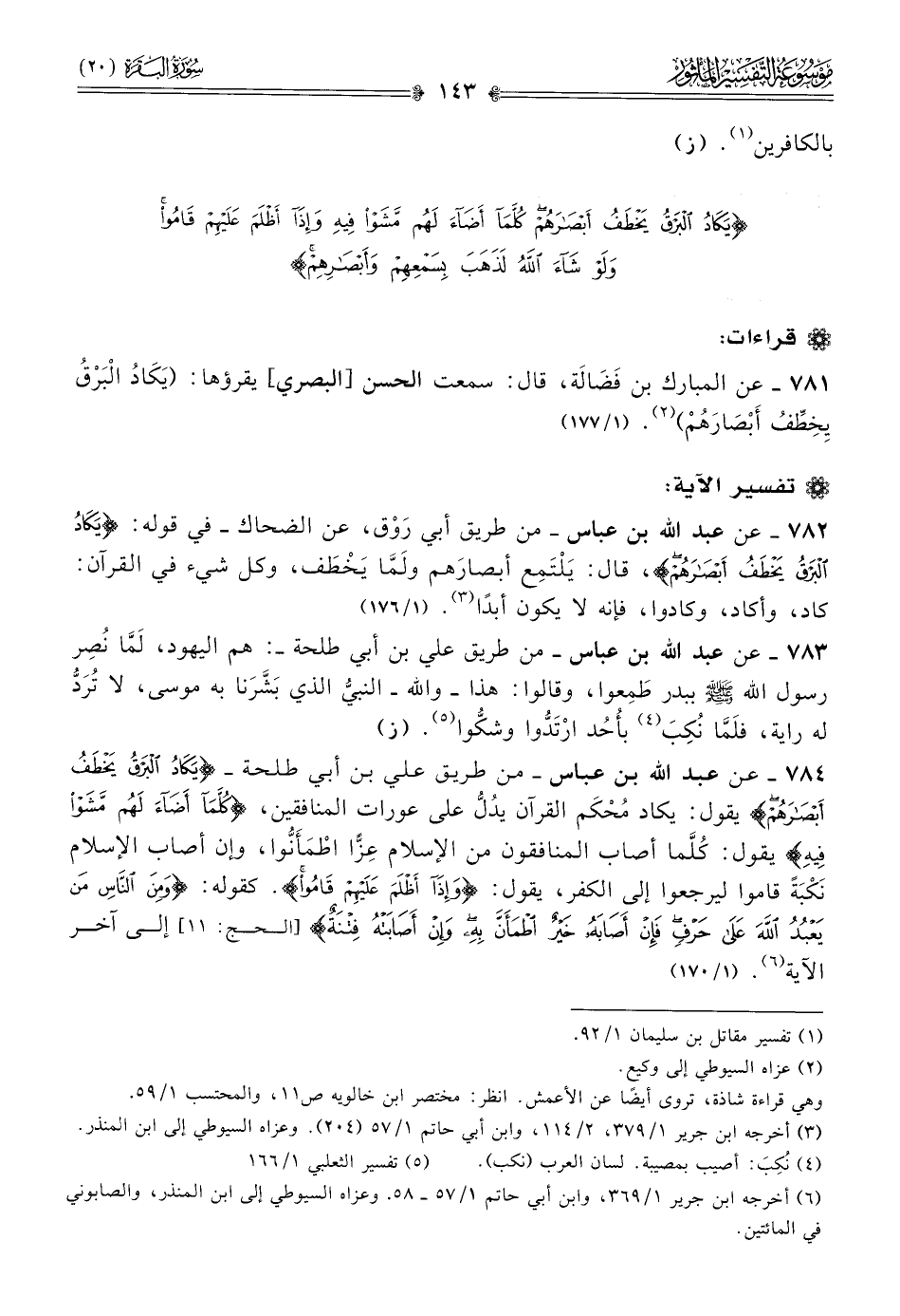 ٧٨٤ - عن عبد الله بن عباس -من طريق علي بن أبي طلحة- {يَكادُ البَرْقُ يَخْطَفُ أبْصارَهُمْ} يقول: يكاد مُحْكَم القرآن يدُلُّ على عورات المنافقين، {كُلَّما أضاءَ لَهُمْ مَشَوْا فِيهِ} يقول: كُلَّما أصاب المنافقون من الإسلام عِزًّا اطْمَأَنُّوا، وإن أصاب الإسلام نَكْبَةً قاموا ليرجعوا إلى الكفر، يقول: {وإذا أظْلَمَ عَلَيْهِمْ قامُوا}. كقوله: {ومن الناس من يعبد الله على حرف فإن أصابه خير اطمأن به وإن أصابته فتنة} [الحج: ١١] إلى آخر الآية (¬٦). (١/ ١٧٠)