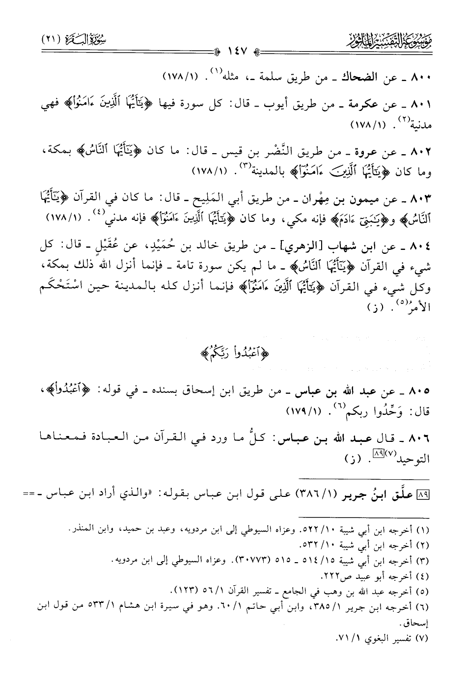 ٨٠٥ - عن عبد الله بن عباس -من طريق ابن إسحاق بسنده- في قوله: {اعبدوا}، قال: وحِّدُوا ربكم (¬٦). (١/ ١٧٩)