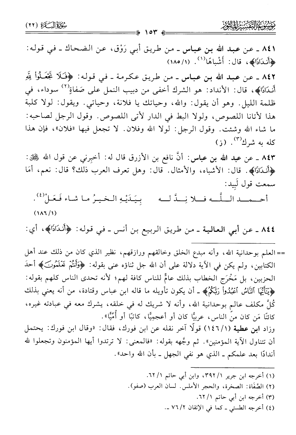 ٨٤٣ - عن عبد الله بن عباس: أنّ نافع بن الأزرق قال له: أخبِرني عن قول الله - عز وجل -: {أندادًا}. قال: الأشباه، والأمثال. قال: وهل تعرف العرب ذلك؟ قال: نعم، أما سمعت قول لَبِيد: