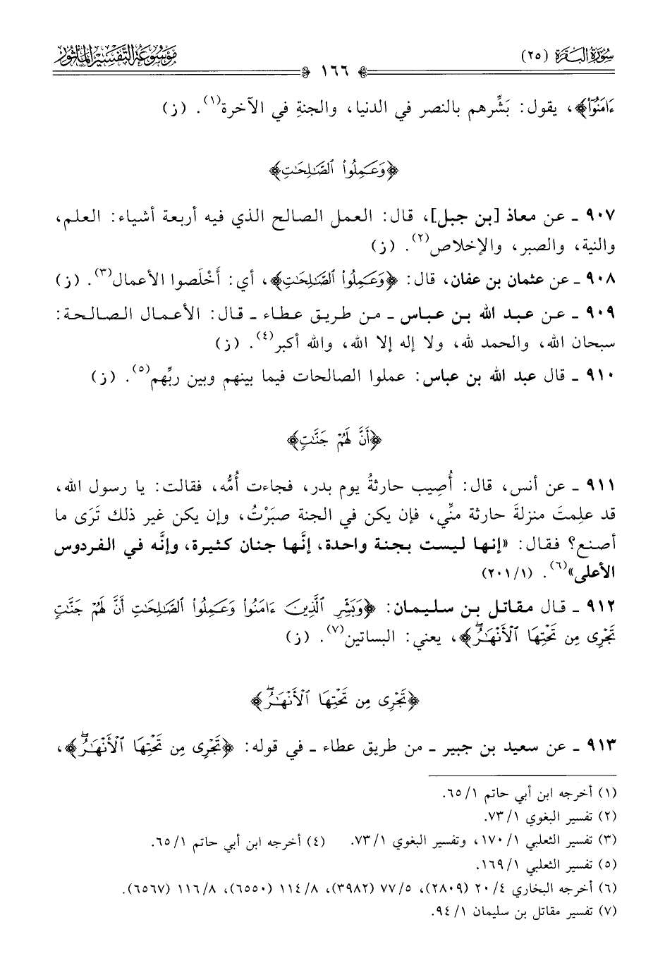 ٩٠٨ - عن عثمان بن عفان، قال: {وعَمِلُوا الصّالِحاتِ}، أي: أخْلَصوا الأعمال (¬٣). (ز)