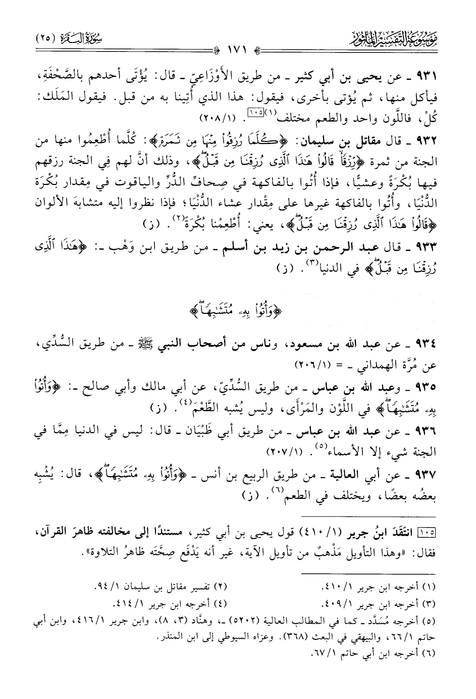 ٩٣٥ - وعبد الله بن عباس -من طريق السُّدِّيّ، عن أبي مالك وأبي صالح- {وأُتُوا بِهِ مُتَشابِهًا} في اللَّوْن والمَرْأى، وليس يُشبه الطَّعْمَ (¬٤). (ز)