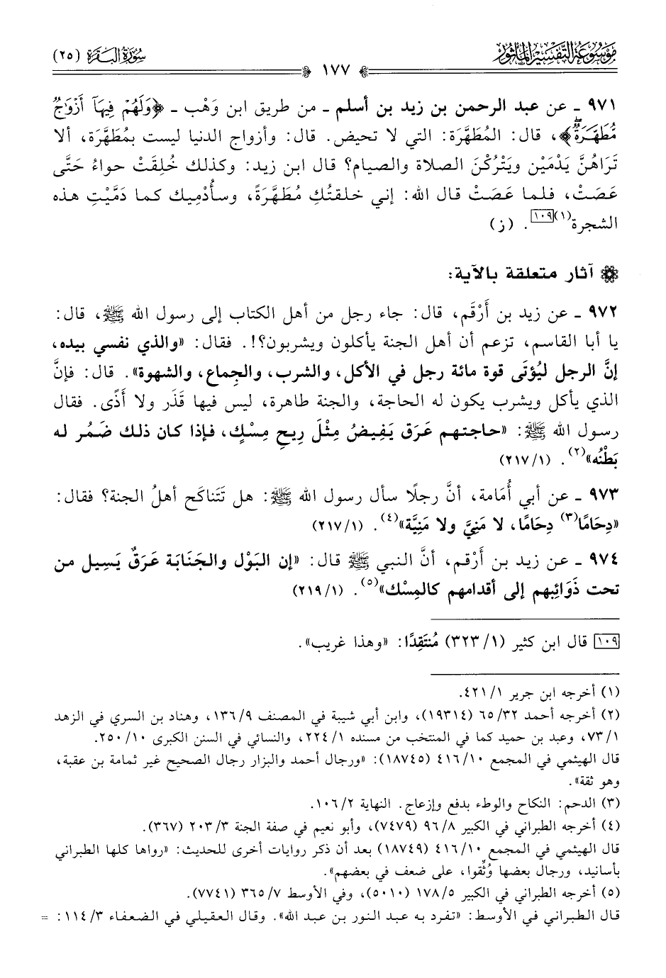 ٩٧١ - عن عبد الرحمن بن زيد بن أسلم -من طريق ابن وهْب- {ولهم فيها أزواج مطهرة}، قال: المُطَهَّرَة: التي لا تحيض. قال: وأزواج الدنيا ليست بمُطَهَّرَة، ألا تَراهُنَّ يَدْمَيْن ويَتْرُكْنَ الصلاة والصيام؟ قال ابن زيد: وكذلك خُلِقَتْ حواءُ حَتّى عَصَتْ، فلما عَصَتْ قال الله: إني خلقتُكِ مُطَهَّرَةً، وسأُدْمِيك كما دَمَّيْتِ هذه الشجرة (¬١) [١٠٩]. (ز)