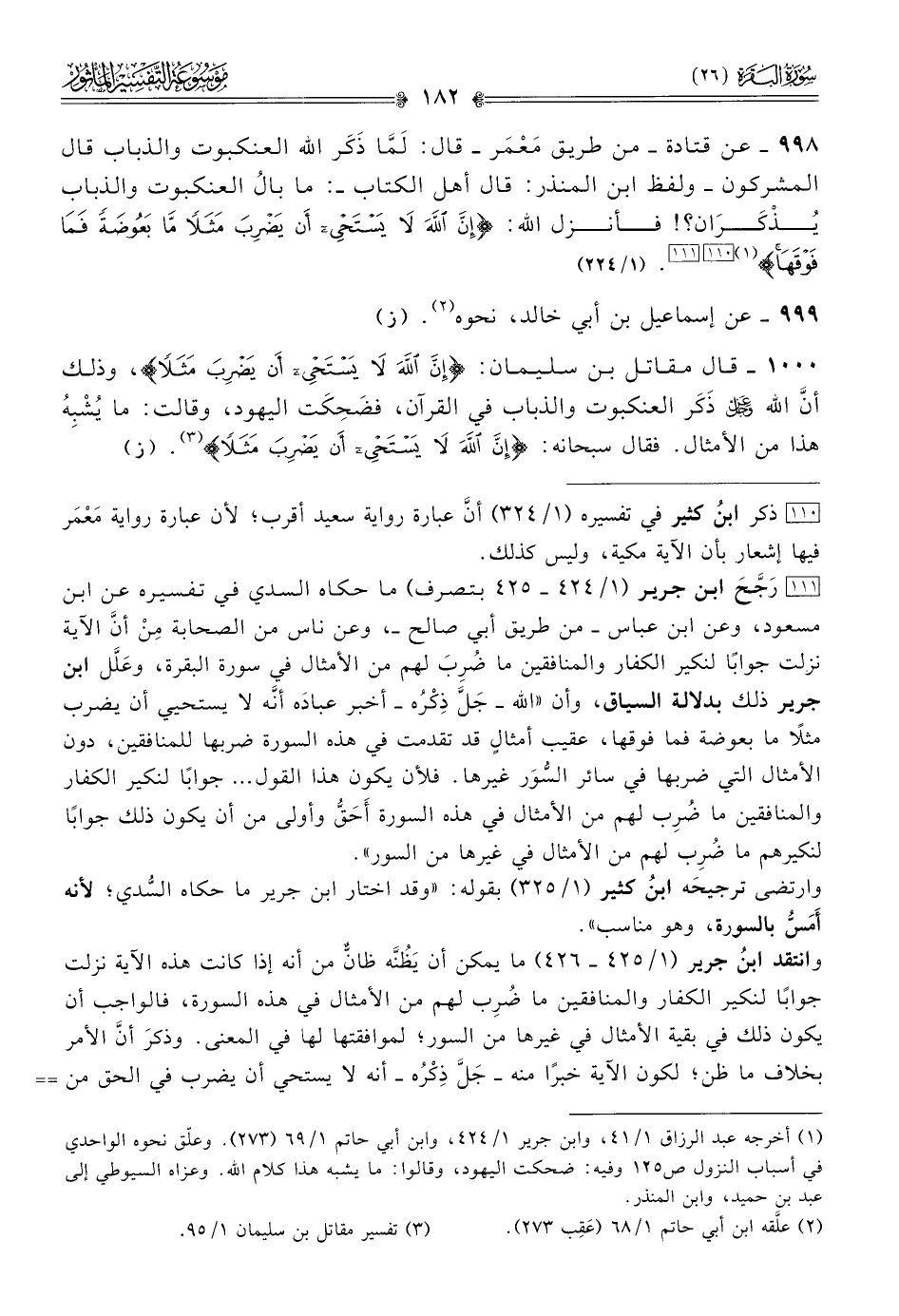 [١١١] رَجَّحَ ابن جرير (١/ ٤٢٤ - ٤٢٥ بتصرف) ما حكاه السدي في تفسيره عن ابن مسعود، وعن ابن عباس -من طريق أبي صالح-، وعن ناس من الصحابة مِن أنّ الآية نزلت جوابًا لنكير الكفار والمنافقين ما ضُرِبَ لهم من الأمثال في سورة البقرة، وعَلَّل ابن جرير ذلك بدلالة السياق، وأن «الله -جَلَّ ذِكْرُه- أخبر عبادَه أنّه لا يستحيي أن يضرب مثلًا ما بعوضة فما فوقها، عقيب أمثالٍ قد تقدمت في هذه السورة ضربها للمنافقين، دون الأمثال التي ضربها في سائر السُّوَر غيرها. فلأن يكون هذا القول ... جوابًا لنكير الكفار والمنافقين ما ضُرِب لهم من الأمثال في هذه السورة أحَقُّ وأولى من أن يكون ذلك جوابًا لنكيرهم ما ضُرِب لهم من الأمثال في غيرها من السور».