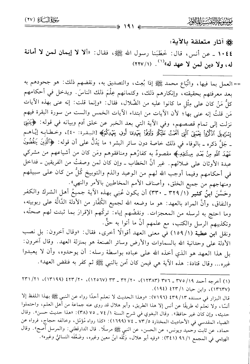 ١٠٤٤ - عن أنس، قال: خَطَبَنا رسول الله - صلى الله عليه وسلم -، فقال: «ألا لا إيمان لمن لا أمانة له، ولا دين لمن لا عهد له» (¬١). (١/ ٢٢٧)