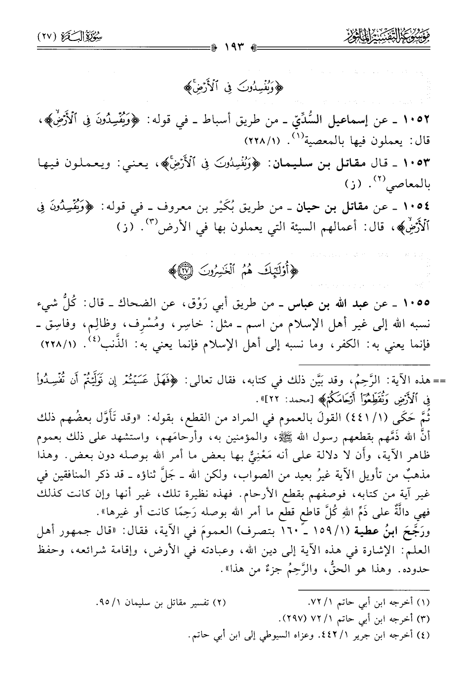 ١٠٥٢ - عن إسماعيل السُّدِّيّ -من طريق أسباط- في قوله: {ويفسدون في الأرض}، قال: يعملون فيها بالمعصية (¬١). (١/ ٢٢٨)