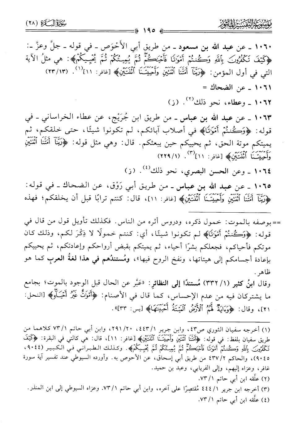 ١٠٦٠ - عن عبد الله بن مسعود -من طريق أبي الأَحْوَص- في قوله -جلَّ وعزَّ-: {كَيْفَ تَكْفُرُونَ بِاللَّهِ وكُنْتُمْ أمْواتًا فَأَحْياكُمْ ثُمَّ يُمِيتُكُمْ ثُمَّ يُحْيِيكُمْ}: هي مثلُ الآية التي في أول المؤمن: {ربنا أمتنا اثنتين وأحييتنا اثنتين} [غافر: ١١] (¬١). (١٣/ ٢٣)