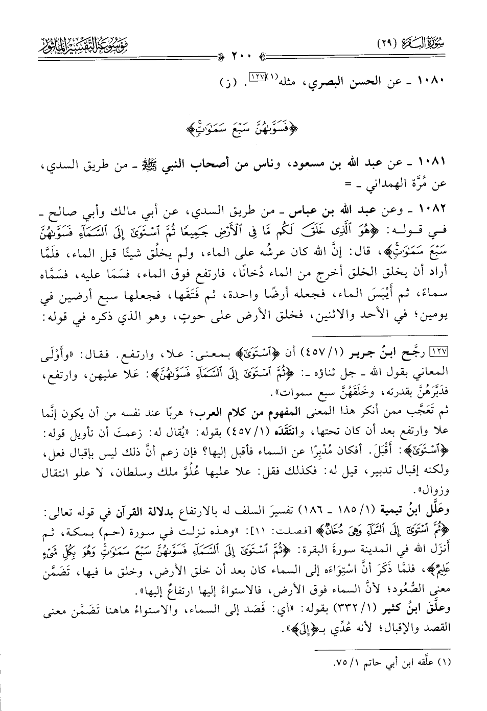 [١٢٧] رجَّح ابنُ جرير (١/ ٤٥٧) أن {استوى} بمعنى: علا، وارتفع. فقال: «وأَوْلى المعاني بقول الله -جل ثناؤه-: {ثم استوى إلى السماء فسواهن}: عَلا عليهن، وارتفع، فدَبَّرَهُنَّ بقدرته، وخَلَقَهُنَّ سبع سموات».