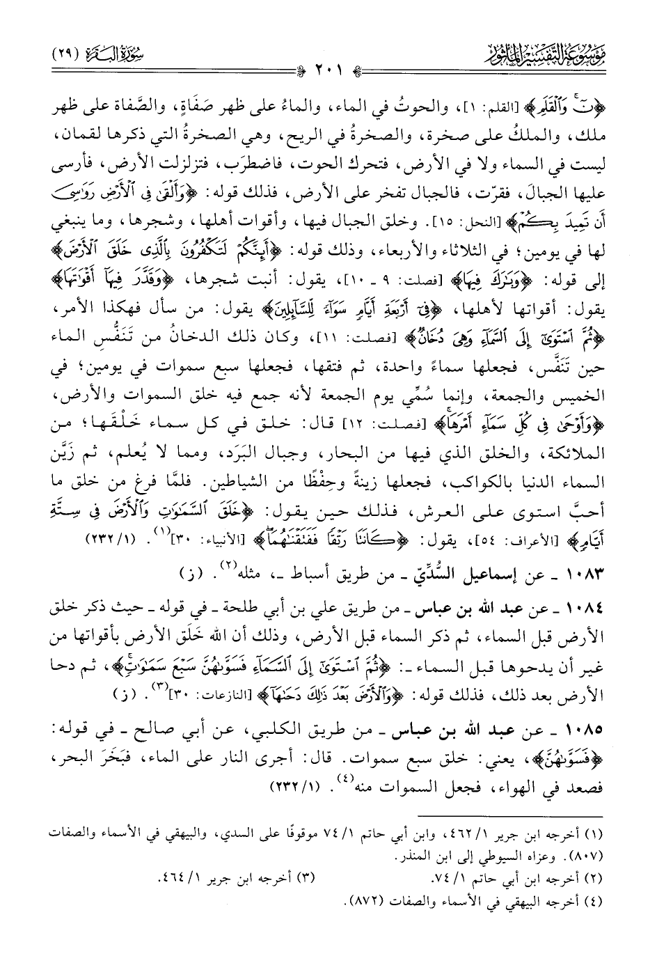 ١٠٨٥ - عن عبد الله بن عباس -من طريق الكلبي، عن أبي صالح- في قوله: {فسواهن}، يعني: خلق سبع سموات. قال: أجرى النار على الماء، فبَخَرَ البحر، فصعد في الهواء، فجعل السموات منه (¬٤). (١/ ٢٣٢)