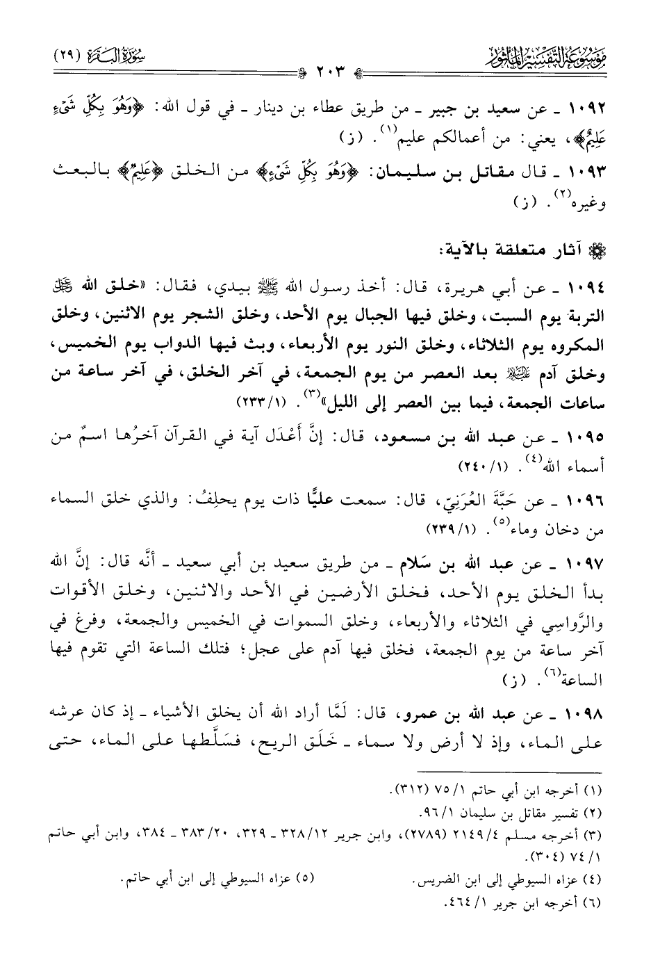 ١٠٩٧ - عن عبد الله بن سَلام -من طريق سعيد بن أبي سعيد- أنّه قال: إنّ الله بدأ الخلق يوم الأحد، فخلق الأرضين في الأحد والاثنين، وخلق الأقوات والرَّواسِي في الثلاثاء والأربعاء، وخلق السموات في الخميس والجمعة، وفرغ في آخر ساعة من يوم الجمعة، فخلق فيها آدم على عجل؛ فتلك الساعة التي تقوم فيها الساعة (¬٦). (ز)
