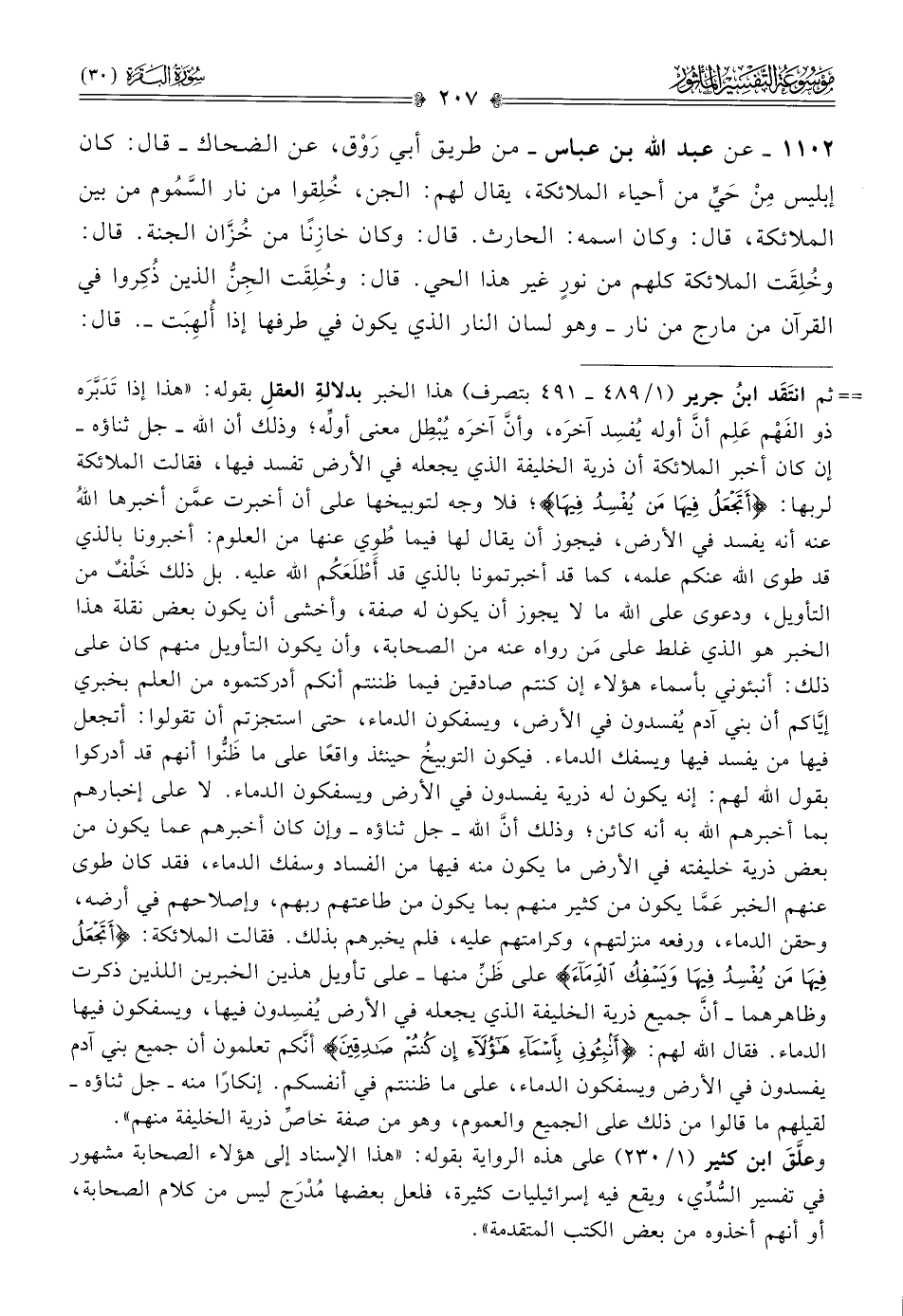 ١١٠٢ - عن عبد الله بن عباس -من طريق أبي رَوْق، عن الضحاك- قال: كان إبليس مِن حَيٍّ من أحياء الملائكة، يقال لهم: الجن، خُلِقوا من نار السَّمُوم من بين الملائكة، قال: وكان اسمه: الحارث. قال: وكان خازِنًا من خُزّان الجنة. قال: وخُلِقَت الملائكة كلهم من نورٍ غير هذا الحي. قال: وخُلِقَت الجِنُّ الذين ذُكِروا في القرآن من مارج من نار -وهو لسان النار الذي يكون في طرفها إذا أُلهِبَت -. قال:
