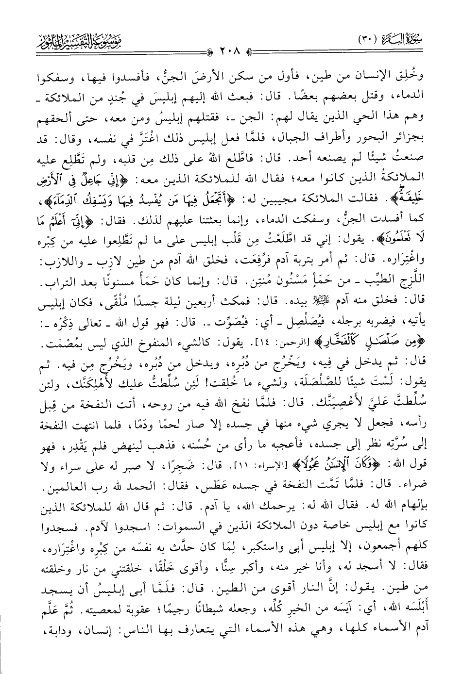 وخُلِق الإنسان من طين، فأول من سكن الأرضَ الجنُّ، فأفسدوا فيها، وسفكوا الدماء، وقتل بعضهم بعضًا. قال: فبعث الله إليهم إبليسَ في جُندٍ من الملائكة -وهم هذا الحي الذين يقال لهم: الجن-، فقتلهم إبليسُ ومن معه، حتى ألحقهم بجزائر البحور وأطراف الجبال، فلمّا فعل إبليس ذلك اغْتَرَّ في نفسه، وقال: قد صنعتُ شيئًا لم يصنعه أحد. قال: فاطَّلع اللهُ على ذلك مِن قلبه، ولم تَطَّلِع عليه الملائكةُ الذين كانوا معه؛ فقال الله للملائكة الذين معه: {إني جاعل في الأرض خليفة}. فقالت الملائكة مجيبين له: {أتجعل فيها من يفسد فيها ويسفك الدماء}، كما أفسدت الجنُّ، وسفكت الدماء، وإنما بعثتنا عليهم لذلك. فقال: {إني أعلم ما لا تعلمون}. يقول: إني قد اطَّلَعْتُ مِن قَلْب إبليس على ما لم تَطَّلِعوا عليه من كِبْره واغْتِراره. قال: ثم أمر بتربة آدم فرُفِعَت، فخلق الله آدم من طين لازِب -واللازب: اللَّزِج الطيِّب- من حَمَأٍ مَسْنُون مُنتِن. قال: وإنما كان حَمَأً مسنونًا بعد التراب. قال: فخلق منه آدم - عليه السلام - بيده. قال: فمكث أربعين ليلة جسدًا مُلْقًى، فكان إبليس يأتيه، فيضربه برجله، فيُصَلْصِل -أي: فيُصَوِّت-. قال: فهو قول الله -تعالى ذِكْرُه-: {من صلصال كالفخار} [الرحمن: ١٤]. يقول: كالشيء المنفوخ الذي ليس بمُصْمَت. قال: ثم يدخل في فِيه، ويَخْرُج من دُبُرِه، ويدخل من دُبُره، ويَخْرُج مِن فيه. ثم يقول: لَسْتَ شيئًا للصَّلْصَلَة، ولشيء ما خُلِقت! لَئِن سُلِّطتُّ عليك لأُهْلِكَنَّك، ولئن سُلِّطتَّ عَليَّ لأَعْصِيَنَّك. قال: فلمّا نفخ الله فيه من روحه، أتت النفخة من قِبل رأسه، فجعل لا يجري شيء منها في جسده إلا صار لحمًا ودَمًا، فلما انتهت النفخة إلى سُرَّتِه نظر إلى جسده، فأعجبه ما رأى من حُسْنه، فذهب لينهض فلم يَقْدِر، فهو قول الله: {وكان الإنسان عجولا} [الإسراء: ١١]. قال: ضَجِرًا، لا صبر له على سراء ولا ضراء. قال: فلمّا تَمَّت النفخة في جسده عَطَس، فقال: الحمد لله رب العالمين. بإلهام الله له. فقال الله له: يرحمك الله، يا آدم. قال: ثم قال الله للملائكة الذين كانوا مع إبليس خاصة دون الملائكة الذين في السموات: اسجدوا لآدم. فسجدوا كلهم أجمعون، إلا إبليس أبى واستكبر، لِما كان حدَّث به نفسَه من كِبْرِه واغْتِراره، فقال: لا أسجد له، وأنا خير منه، وأكبر سِنًّا، وأقوى خَلْقًا، خلقتني من نار وخلقته من طين. يقول: إنّ النار أقوى من الطين. قال: فلَمّا أبى إبليسُ أن يسجد أبْلَسَه الله، أي: آيَسَه من الخيرِ كُلِّه، وجعله شيطانًا رجيمًا؛ عقوبة لمعصيته. ثُمَّ عَلَّم آدم الأسماء كلها، وهي هذه الأسماء التي يتعارف بها الناس: إنسان، ودابة،