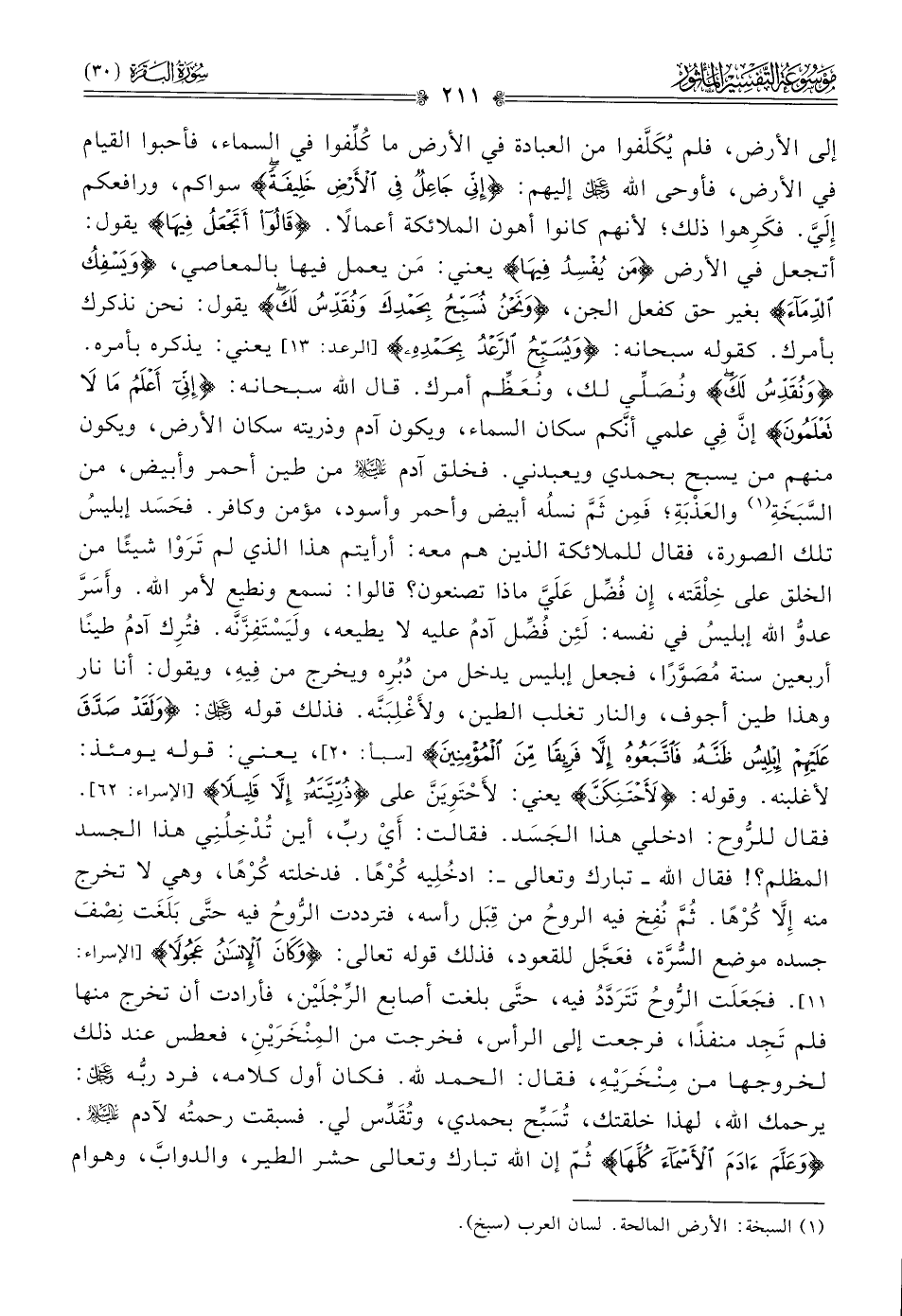 إلى الأرض، فلم يُكَلَّفوا من العبادة في الأرض ما كُلِّفوا في السماء، فأحبوا القيام في الأرض، فأوحى الله - عز وجل - إليهم: {إني جاعل فِي الأرض خليفة} سواكم، ورافعكم إلَيَّ. فكَرِهوا ذلك؛ لأنهم كانوا أهون الملائكة أعمالًا. {قالُوا أتَجْعَلُ فِيها} يقول: أتجعل في الأرض {مَن يُفْسِدُ فِيها} يعني: مَن يعمل فيها بالمعاصي، {ويَسْفِكُ الدِّماءَ} بغير حق كفعل الجن، {ونَحْنُ نُسَبِّحُ بِحَمْدِكَ ونُقَدِّسُ لَكَ} يقول: نحن نذكرك بأمرك. كقوله سبحانه: {ويُسَبِّحُ الرَّعْدُ بِحَمْدِهِ} [الرعد: ١٣] يعني: يذكره بأمره. {ونقدس لك} ونُصَلِّي لك، ونُعَظِّم أمرك. قال الله سبحانه: {إنِّي أعْلَمُ ما لا تَعْلَمُونَ} إنّ فِي علمي أنّكم سكان السماء، ويكون آدم وذريته سكان الأرض، ويكون منهم من يسبح بحمدي ويعبدني. فخلق آدم - عليه السلام - من طين أحمر وأبيض، من السَّبَخَةِ (¬١) والعَذْبَةِ؛ فَمِن ثَمَّ نسلُه أبيض وأحمر وأسود، مؤمن وكافر. فحَسَد إبليسُ تلك الصورة، فقال للملائكة الذين هم معه: أرأيتم هذا الذي لم تَرَوْا شيئًا من الخلق على خِلْقَته، إن فُضِّل عَلَيَّ ماذا تصنعون؟ قالوا: نسمع ونطيع لأمر الله. وأَسَرَّ عدوُّ الله إبليسُ في نفسه: لَئِن فُضِّل آدمُ عليه لا يطيعه، ولَيَسْتَفِزَّنَّه. فتُرِك آدمُ طينًا أربعين سنة مُصَوَّرًا، فجعل إبليس يدخل من دُبُرِه ويخرج من فِيهِ، ويقول: أنا نار وهذا طين أجوف، والنار تغلب الطين، ولأَغْلِبَنَّه. فذلك قوله - عز وجل -: {ولَقَدْ صَدَّقَ عَلَيْهِمْ إبْلِيسُ ظَنَّهُ فاتَّبَعُوهُ إلّا فَرِيقًا مِنَ المُؤْمِنِينَ} [سبأ: ٢٠]، يعني: قوله يومئذ: لأغلبنه. وقوله: {لأحتنكن} يعني: لأَحْتَوِيَنَّ على {ذريته إلّا قليلا} [الإسراء: ٦٢]. فقال للرُّوح: ادخلي هذا الجَسَد. فقالت: أيْ ربِّ، أين تُدْخِلُنِي هذا الجسد المظلم؟! فقال الله -تبارك وتعالى-: ادخُلِيه كُرْهًا. فدخلته كُرْهًا، وهي لا تخرج منه إلّا كُرْهًا. ثُمَّ نُفِخ فيه الروحُ من قِبَل رأسه، فترددت الرُّوحُ فيه حتّى بَلَغَت نِصْفَ جسده موضع السُّرَّة، فعَجَّل للقعود، فذلك قوله تعالى: {وكانَ الإنْسانُ عَجُولًا} [الإسراء: ١١]. فجَعَلَت الرُّوحُ تَتَرَدَّدُ فيه، حتّى بلغت أصابع الرِّجْلَيْن، فأرادت أن تخرج منها فلم تَجِد منفذًا، فرجعت إلى الرأس، فخرجت من المِنخَرَيْنِ، فعطس عند ذلك لخروجها من مِنخَرَيْهِ، فقال: الحمد لله. فكان أول كلامه، فرد ربُّه - عز وجل -: يرحمك الله، لهذا خلقتك، تُسَبِّح بحمدي، وتُقَدِّس لي. فسبقت رحمتُه لآدم - عليه السلام -. {وعَلَّمَ آدَمَ الأَسْماءَ كُلَّها} ثُمّ إن اللَّه تبارك وتعالى حشر الطير، والدوابَّ، وهوام