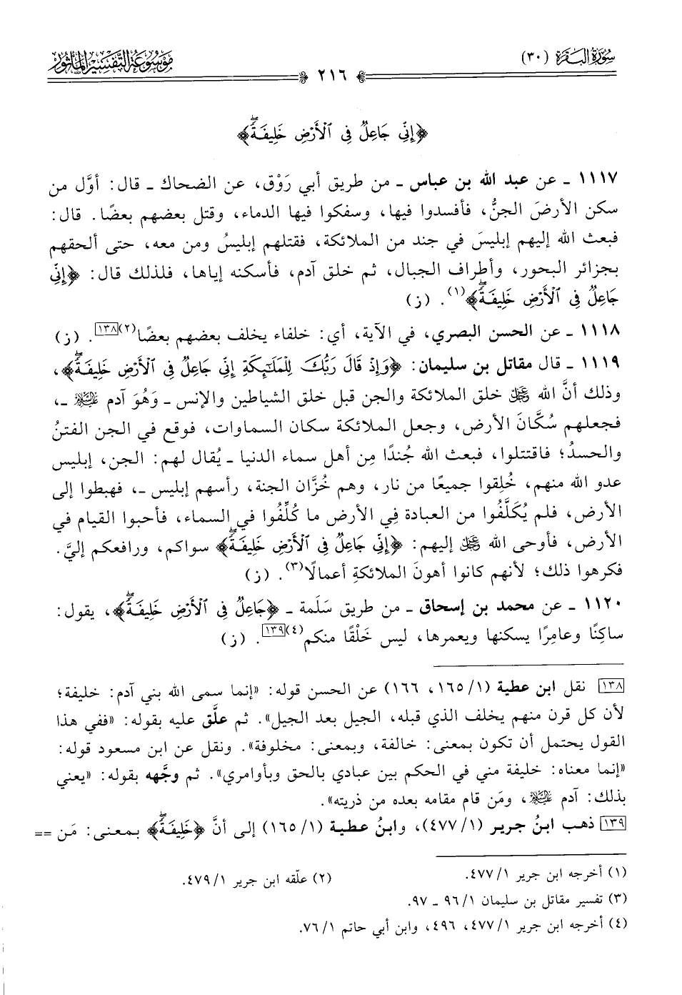 [١٣٨] نقل ابن عطية (١/ ١٦٥، ١٦٦) عن الحسن قوله: «إنما سمى الله بني آدم: خليفة، لأن كل قرن منهم يخلف الذي قبله، الجيل بعد الجيل». ثم علَّق عليه بقوله: «ففي هذا القول يحتمل أن تكون بمعنى: خالفة، وبمعنى: مخلوفة». ونقل عن ابن مسعود قوله: «إنما معناه: خليفة مني في الحكم بين عبادي بالحق وبأوامري». ثم وجَّهه بقوله: «يعني بذلك: آدم - عليه السلام -، ومَن قام مقامه بعده من ذريته».