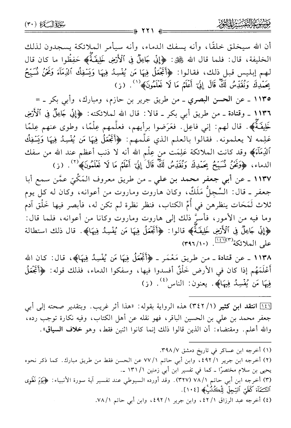 ١١٣٨ - عن قتادة -من طريق مَعْمَر- {أتجعل فيها من يفسد فيها}، قال: كان الله أعْلَمَهُم إذا كان في الأرض خَلْقٌ أفسدوا فيها، وسفكوا الدماء، فذلك قوله: {أتجعل فيها من يفسد فيها}. يعنون: الناس (¬٤). (ز)