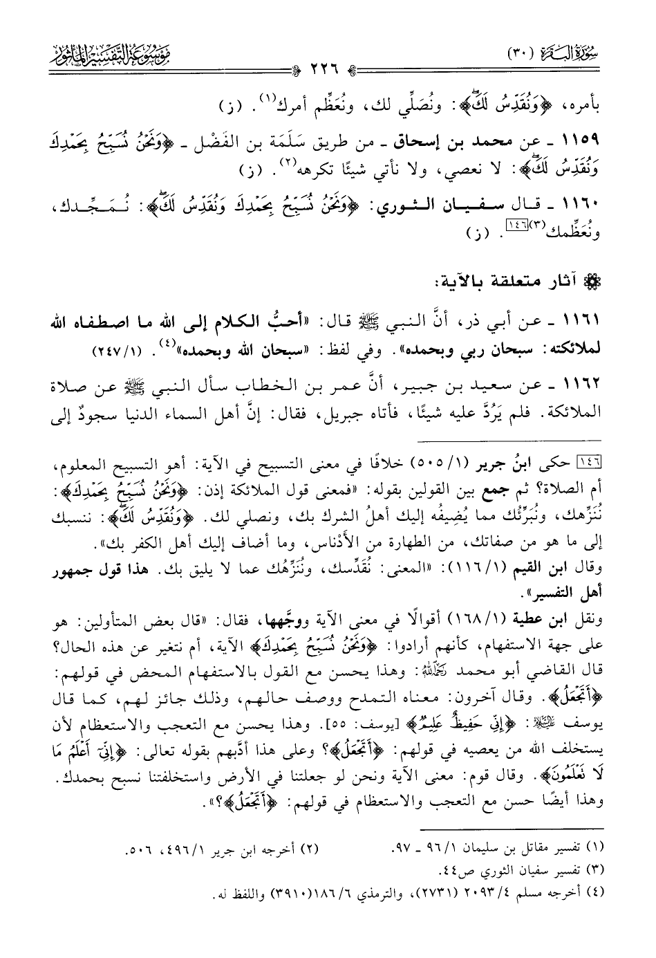 [١٤٦] حكى ابنُ جرير (١/ ٥٠٥) خلافًا في معنى التسبيح في الآية: أهو التسبيح المعلوم، أم الصلاة؟ ثم جمع بين القولين بقوله: «فمعنى قول الملائكة إذن: {ونحن نسبِّح بحمدك}: نُنَزِّهك، ونُبَرِّئُك مما يُضِيفُه إليك أهلُ الشرك بك، ونصلي لك. {ونقدس لك}: ننسبك إلى ما هو من صفاتك، من الطهارة من الأَدْناس، وما أضاف إليك أهل الكفر بك».