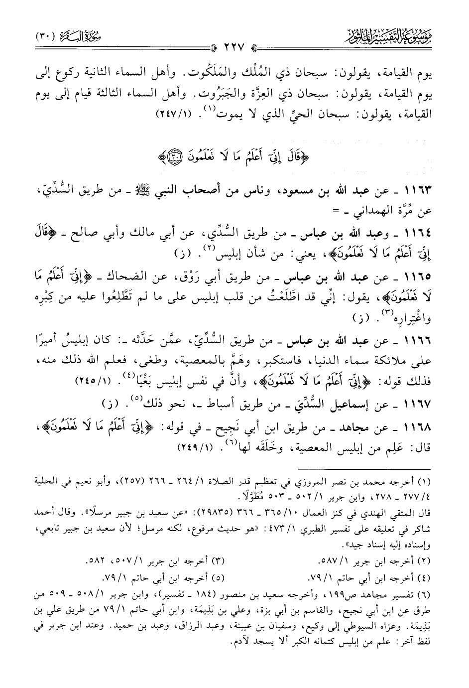 ١١٦٤ - وعبد الله بن عباس -من طريق السُّدِّي، عن أبي مالك وأبي صالح- {قالَ إنِّي أعْلَمُ ما لا تَعْلَمُونَ}، يعني: من شأن إبليس (¬٢). (ز)