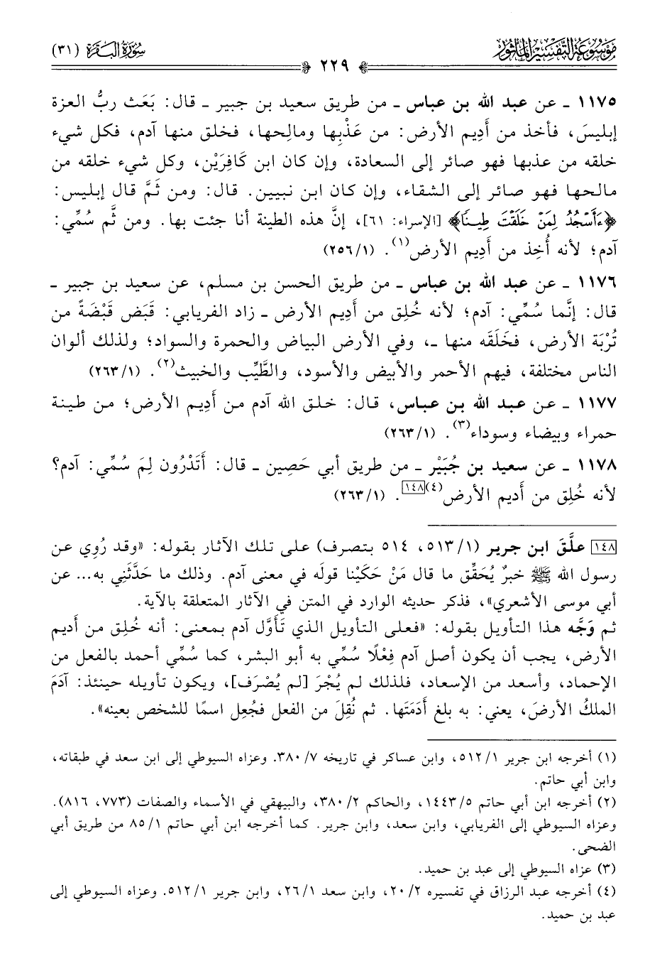 ١١٧٥ - عن عبد الله بن عباس -من طريق سعيد بن جبير- قال: بَعَث ربُّ العزة إبليسَ، فأخذ من أدِيم الأرض: من عَذْبِها ومالِحها، فخلق منها آدم، فكل شيء خلقه من عذبها فهو صائر إلى السعادة، وإن كان ابن كافِرَيْن، وكل شيء خلقه من مالحها فهو صائر إلى الشقاء، وإن كان ابن نبيين. قال: ومن ثَمَّ قال إبليس: {أأسجد لمن خلقت طينا}، إنّ هذه الطينة أنا جئت بها. ومن ثَّم سُمِّي: آدم؛ لأنه أُخِذ من أدِيم الأرض (¬١). (١/ ٢٥٦)