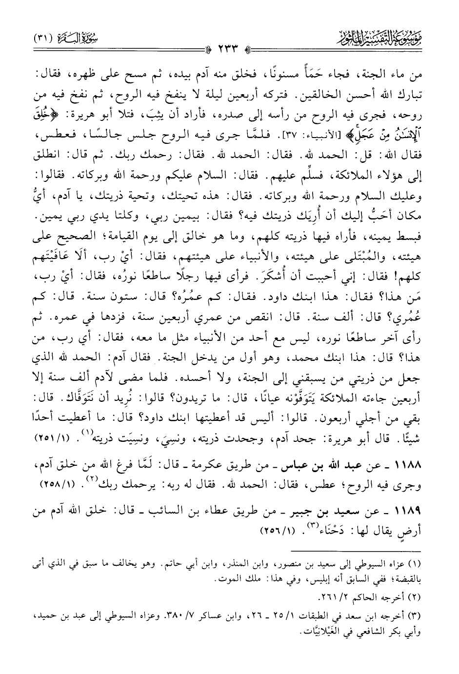 ١١٨٨ - عن عبد الله بن عباس -من طريق عكرمة- قال: لَمّا فرغ الله من خلق آدم، وجرى فيه الروح؛ عطس، فقال: الحمد لله. فقال له ربه: يرحمك ربك (¬٢). (١/ ٢٥٨)