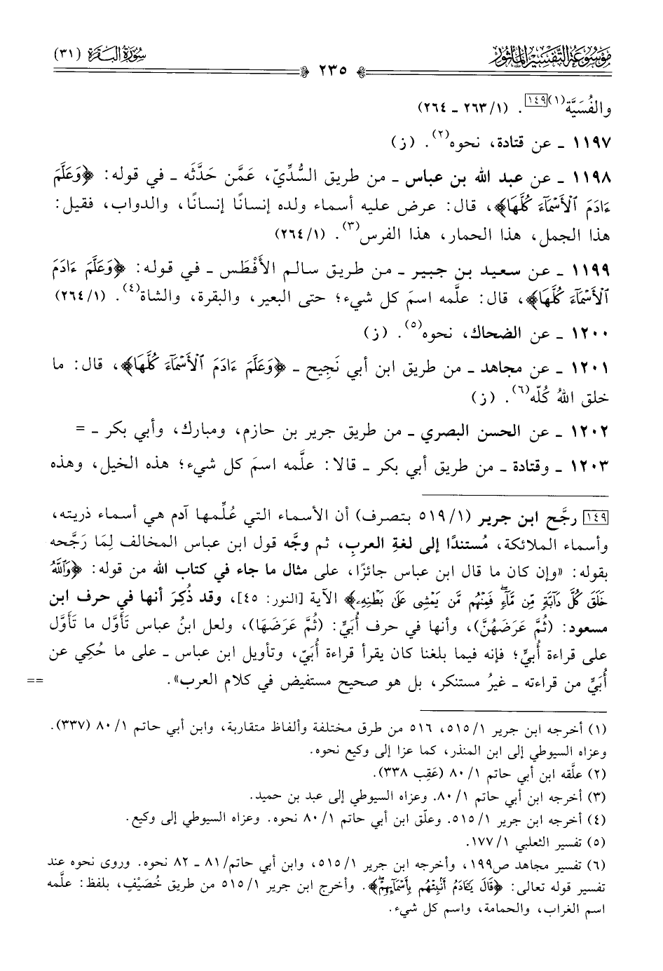١١٩٩ - عن سعيد بن جبير -من طريق سالم الأَفْطَس- في قوله: {وعلم آدم الأسماء كلها}، قال: علَّمه اسمَ كل شيء؛ حتى البعير، والبقرة، والشاة (¬٤). (١/ ٢٦٤)